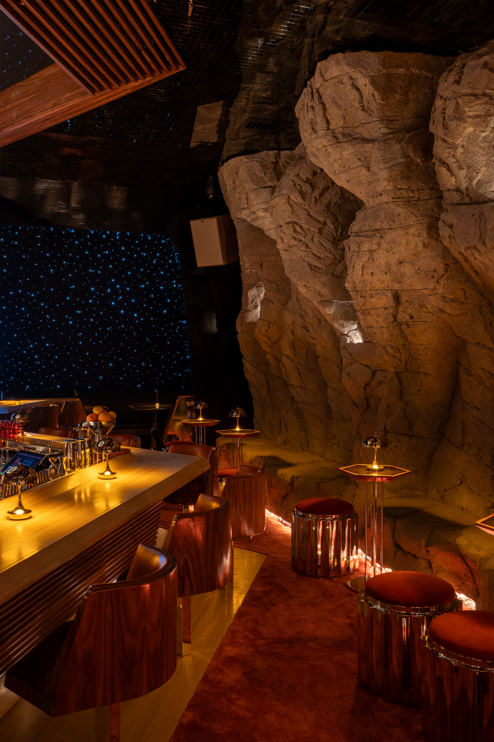 Starlite, one of San Diego’s most iconic bar-restaurants, entrusted the interior design studio Bells + Whistles (B+W) with the task of reimagining its celebrated environment. Recognized for its loyal following and distinctive character, the establishment sought a renovation that would preserve its legacy while embracing a new chapter. Originally conceived and hand-crafted by B+W in 2007 as a design/build project, the space combined the glamour of the Rat Pack era with influences drawn from John Lautner’s organic architecture, the geological drama of Carlsbad Caverns, the cinematic worlds of Star Wars, 1970s Italian Futurism, and Hitchcock’s North by Northwest.