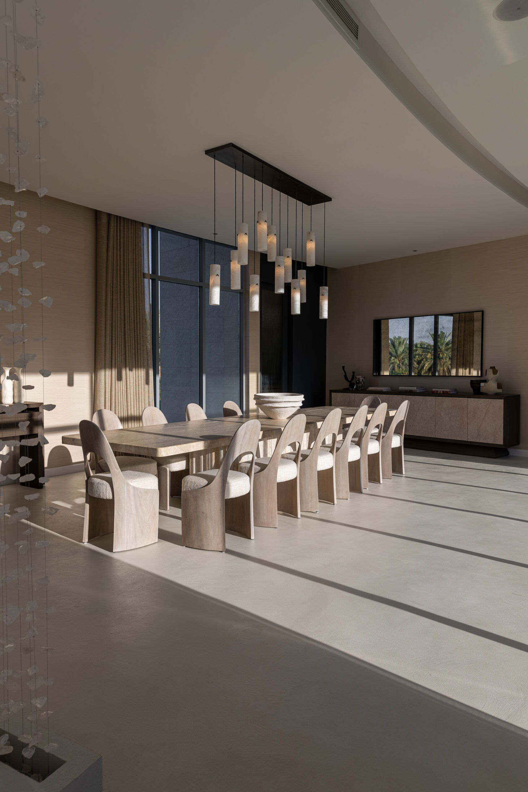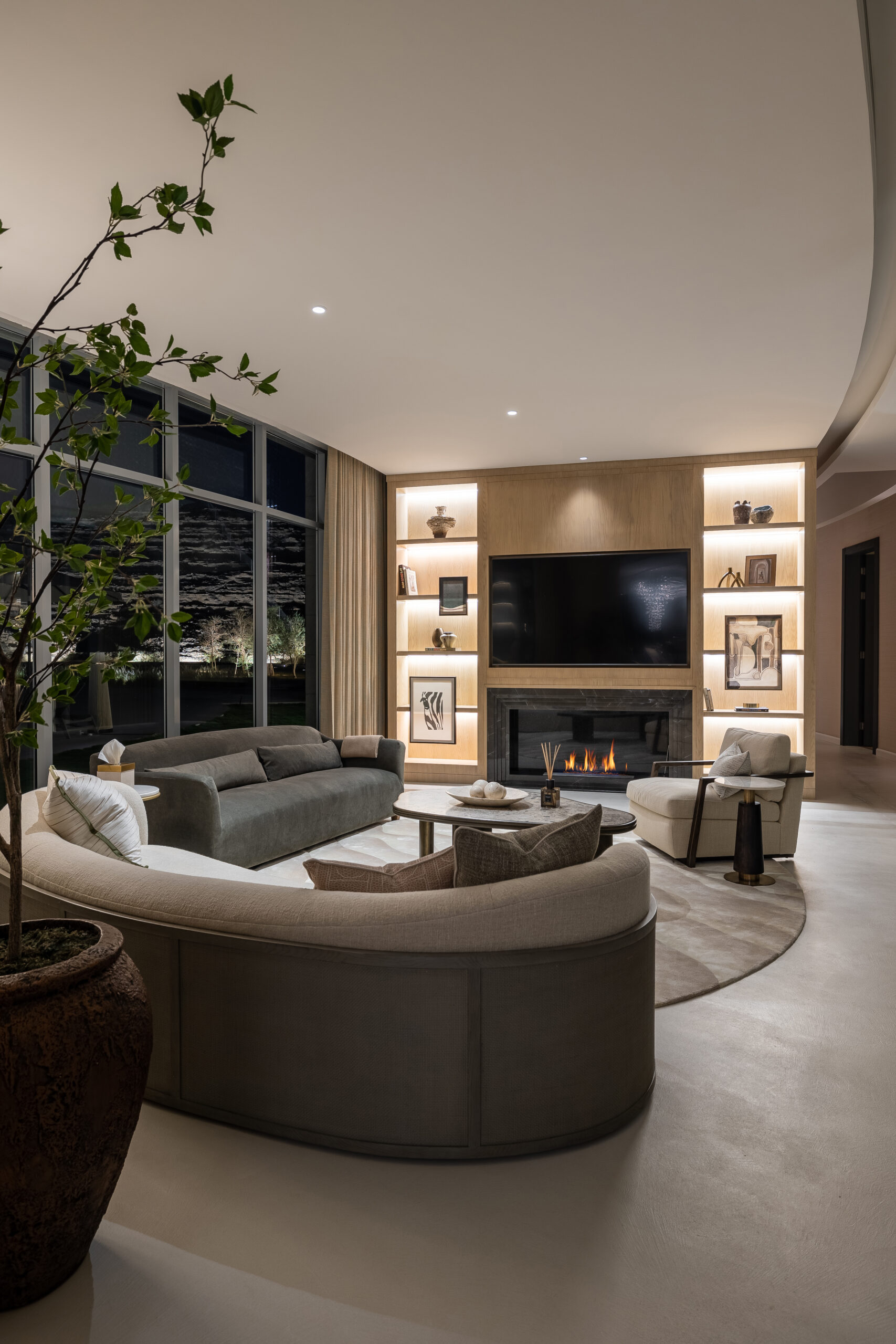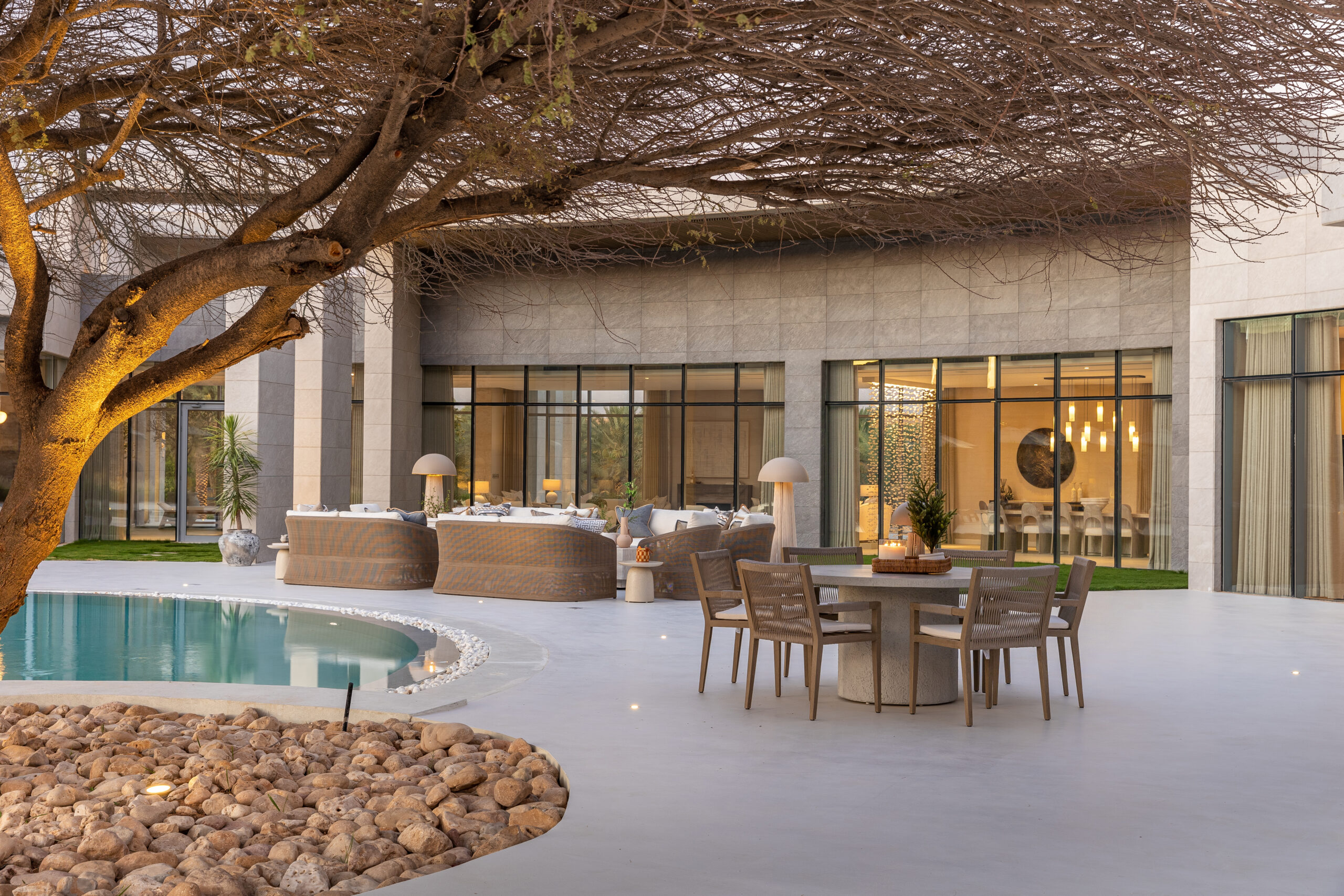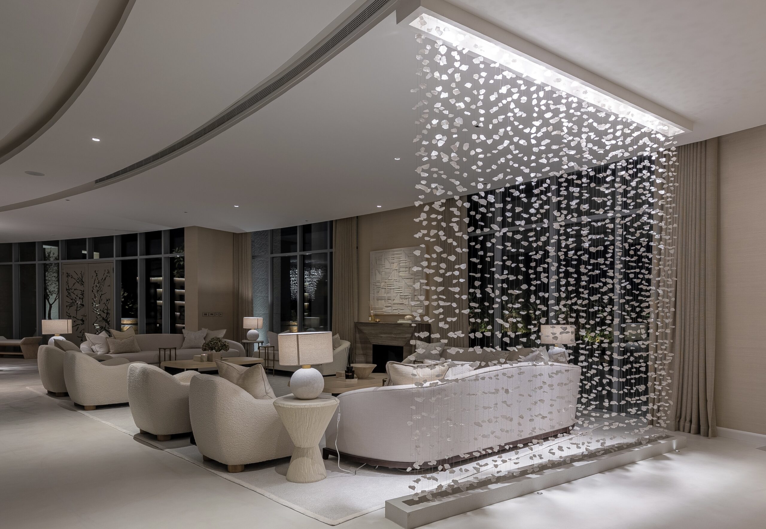 Buthaina Humaidy Interiors approached this farmhouse project with a deep sensitivity to its natural setting, drawing inspiration from the Ammariyah stone hills. The entryway is defined by layered textures, gently illuminated by delicate, sparkling lighting that enhances the character of the natural rock formations. This thoughtful interplay of material and light creates a calm and refined first impression, allowing the surrounding landscape to permeate the interior.