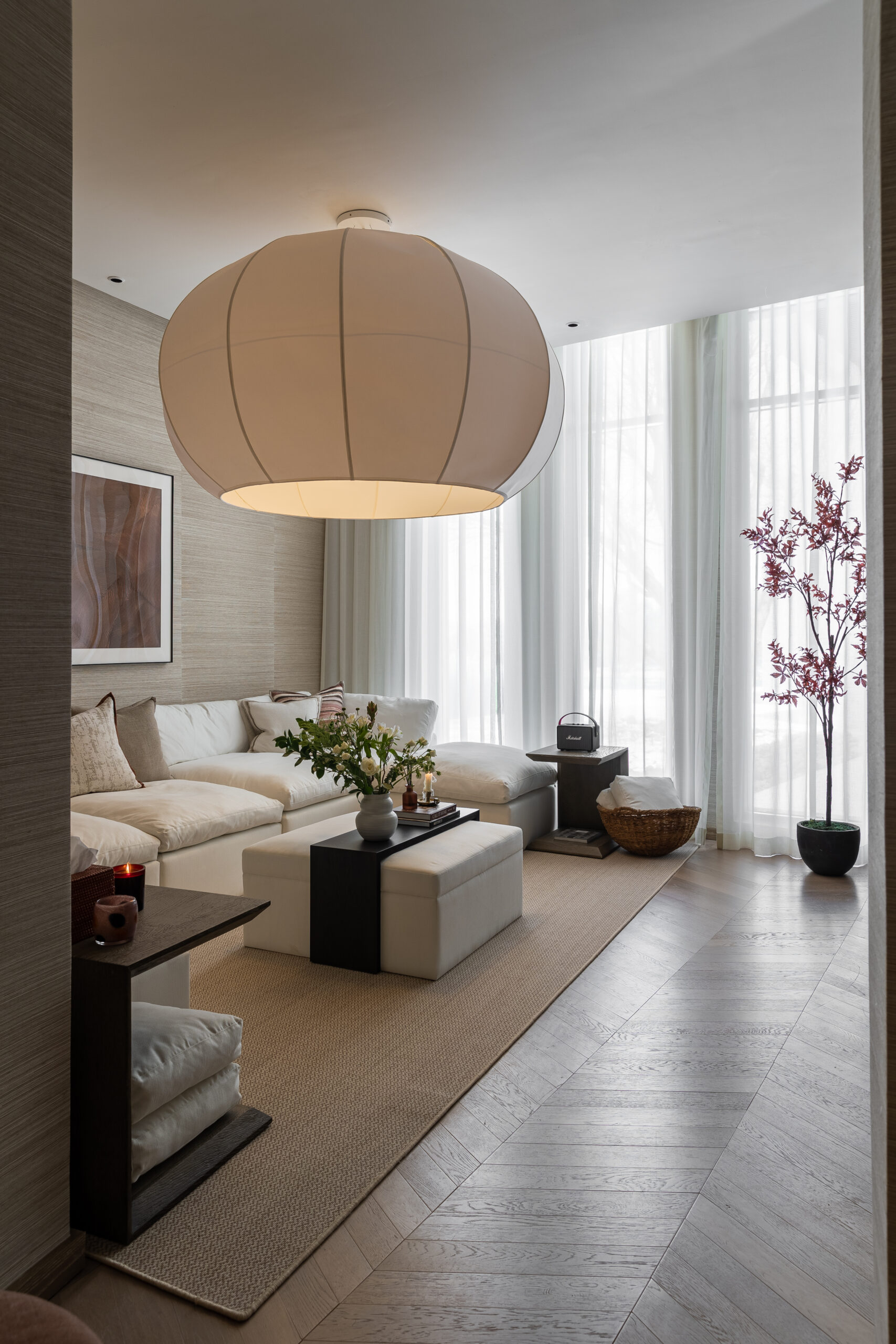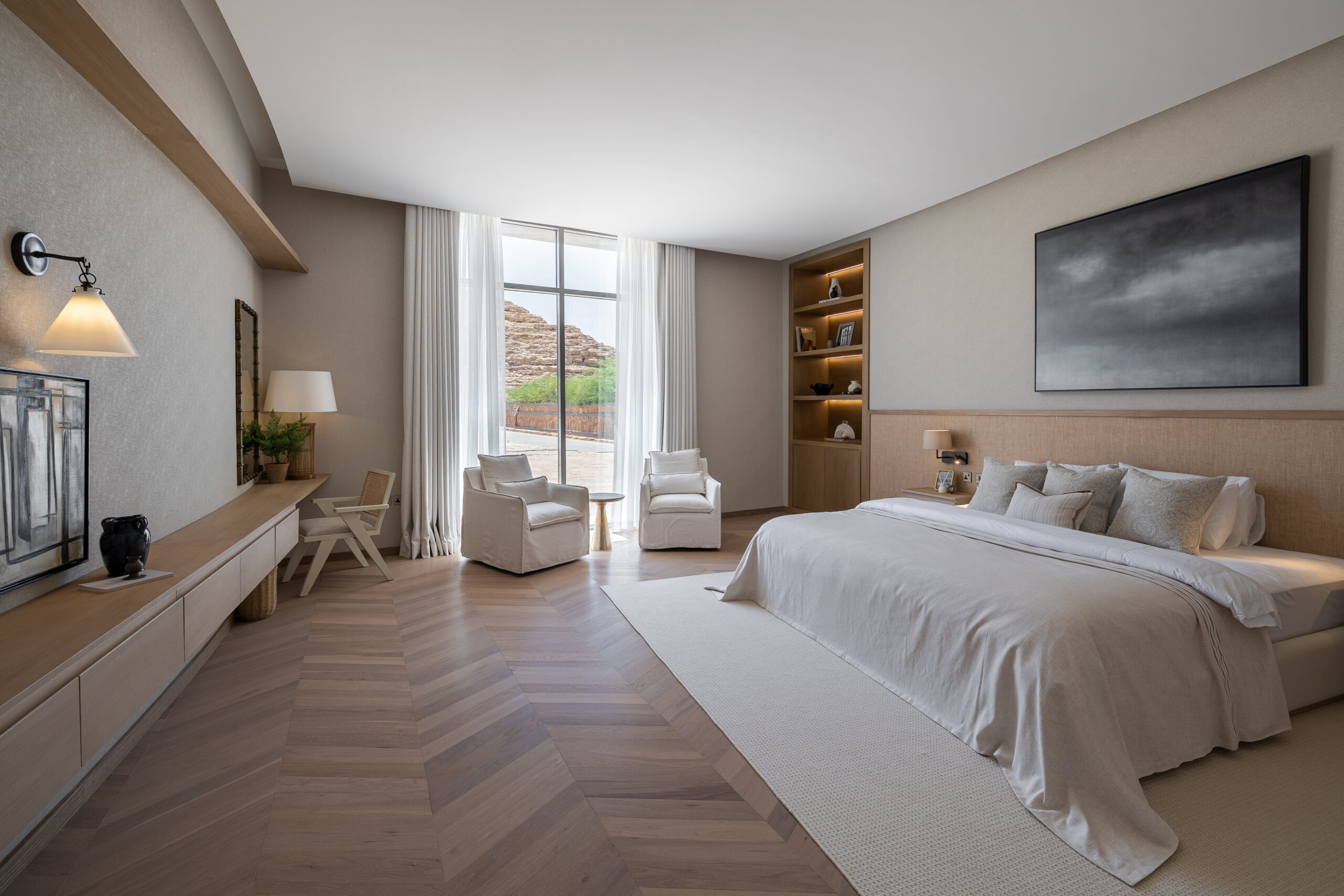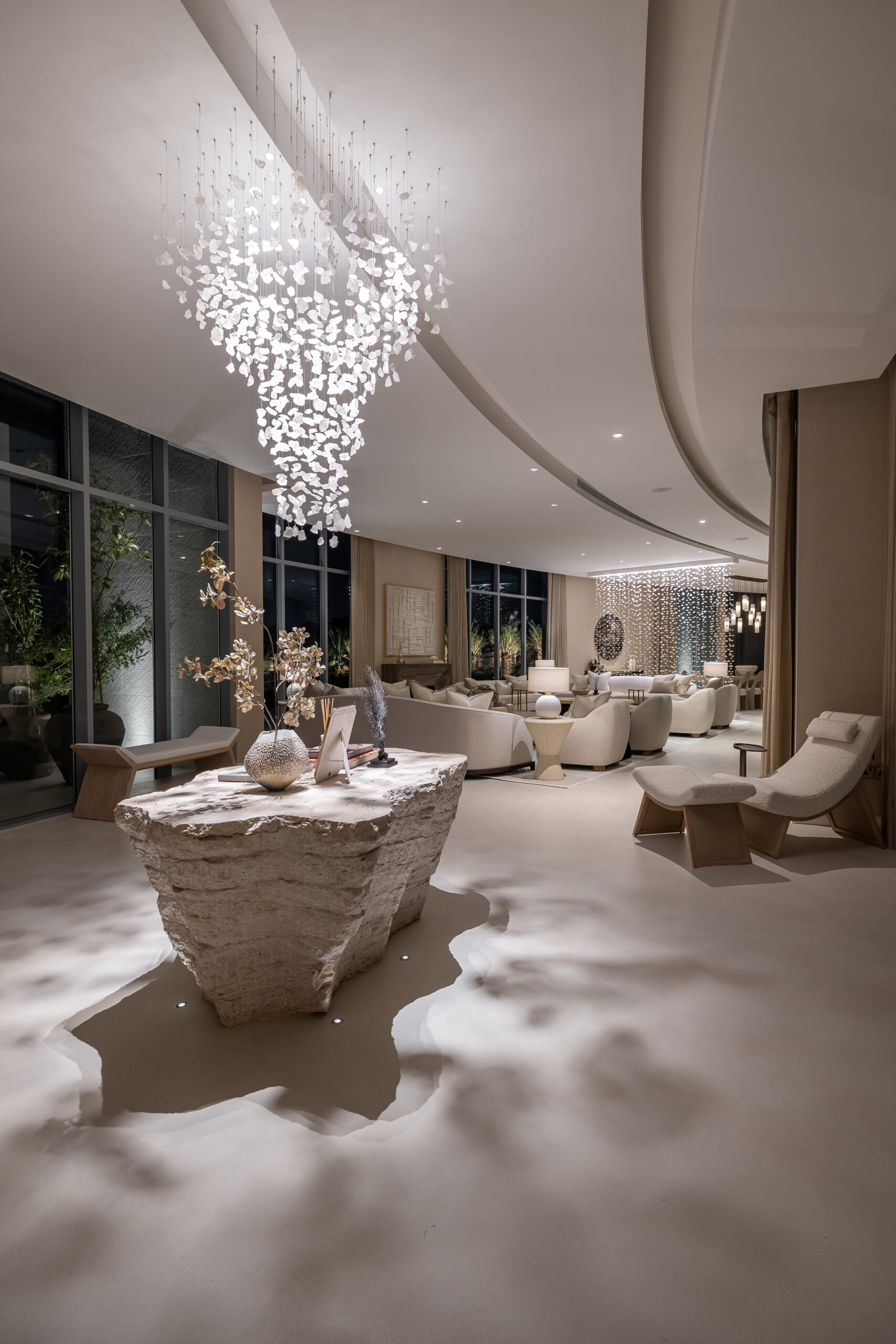 Buthaina Humaidy Interiors approached this farmhouse project with a deep sensitivity to its natural setting, drawing inspiration from the Ammariyah stone hills. The entryway is defined by layered textures, gently illuminated by delicate, sparkling lighting that enhances the character of the natural rock formations. This thoughtful interplay of material and light creates a calm and refined first impression, allowing the surrounding landscape to permeate the interior.