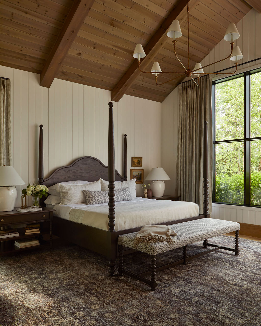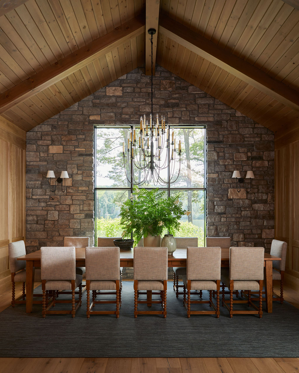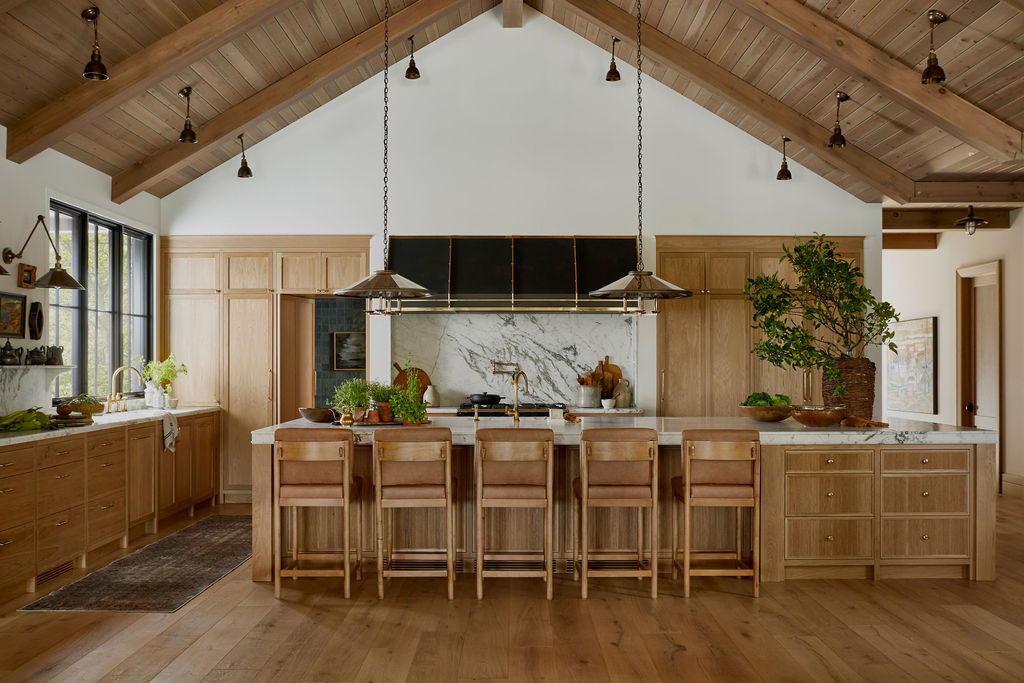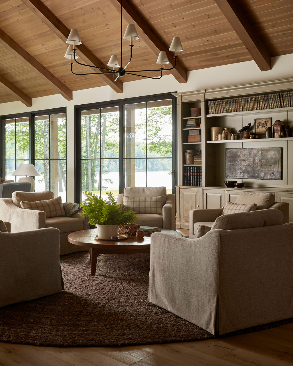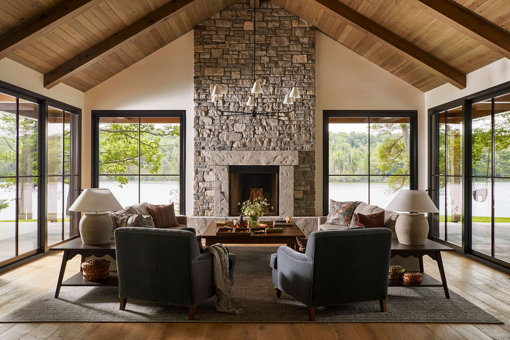 Sight lines frame views of the lake and forest, keeping the landscape as a constant visual anchor. Furniture, lighting and decorative elements were curated and custom designed to combine refined silhouettes with relaxed, liveable forms. Intimate moments such as a built in banquette dining area and a vintage portrait gallery wall introduce history and soul, offering a cosy counterpoint to the home’s scale.