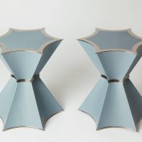 The Lola Side Table is a sassy and highly original table with an optional integrated and adjustable lamp.  Inspired by the skirt of 50s movie screen icon, Gina Lollobrigida, the table features a wasp-waisted gently curved hexagonal base, mirrored by an hourglass lampshade.  The base is covered in faux leather and trim details with polished nickel and the shade is in silk with trimmed waist. Lola is also available in other finishes including bronze with a marble verre églomisé top, various veneers and marble stone top.