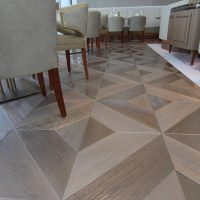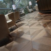 The overall scheme presented a combination of rich textures and design elements, whilst retaining an elegant neutral tone within the space. The brief was to create an opulent yet understated complement to the scheme, whilst incorporating a floor layout that made best use of the floor shape. A custom sized geometric panel format was selected, creating a multi-dimensional pattern that would create a more dynamic look than traditional parquet formats. To incorporate the varying finishes planned, each part of the panel would need to be individually created and finished prior to the final construction. This represented over 8,000 individual pieces of timber; hand machined and hand finished prior to assembly, to yield 750 panels. Key to all geometric pattern work is the accuracy of the panel dimensions and lines within; precise cutting and construction is critical.