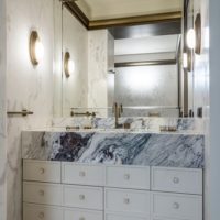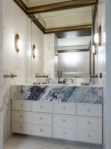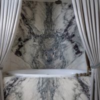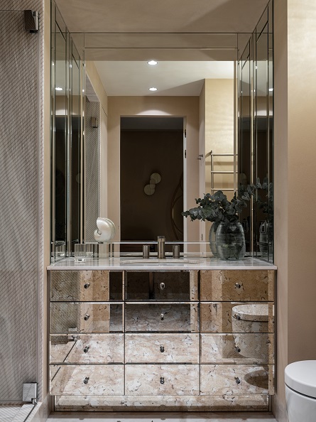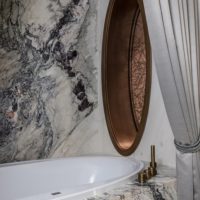 As the customer rarely cooks at home, the team decided to expand the space and make it lighter by combining the kitchen with the living room. The project is also saturated with various textures and materials, combined within the framework of one colour scheme. This design works well thanks to the enfilade-type layout, that was designed specifically to increase the visual space, due to the smooth flow of one room into another. The key aspect of this interior is the window in the master bathroom. The bathroom block adjoins the balcony and it seemed that it would be interesting to add air and volume to the room, and this is how an oval window appeared. The unusual texture and colour of glass from Bernard Pictet brought harmony and individuality to the interior.