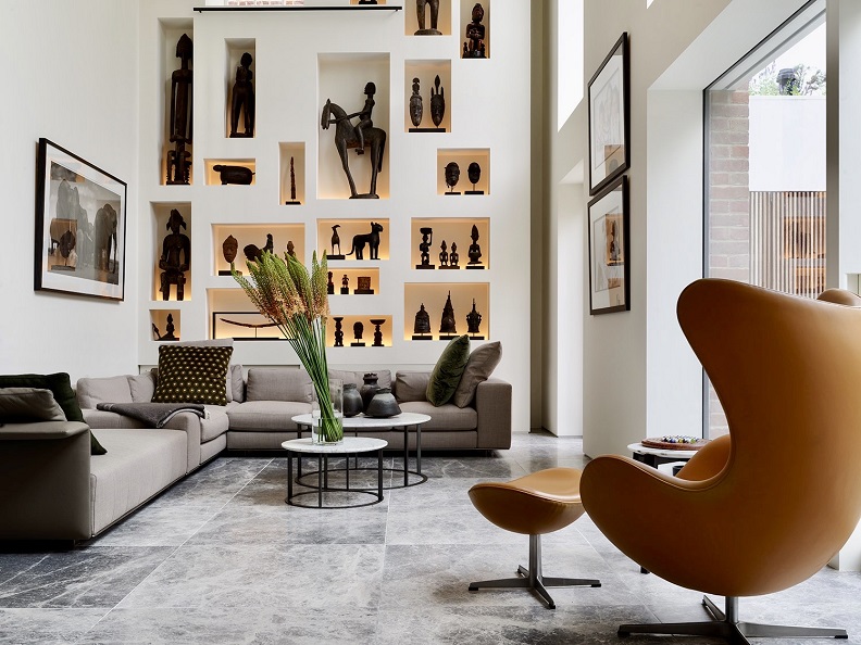 The owner also wanted a house to showcase their impressive and precious collection of African art which they had built up over the years, this area was created in the double storey living room, ensuring that the pieces can be seen from various parts of the home. The use of different texture and material has been carefully selected from the outset to create a warm and totally unique atmosphere. The first floor is dedicated completely to the master bedroom.