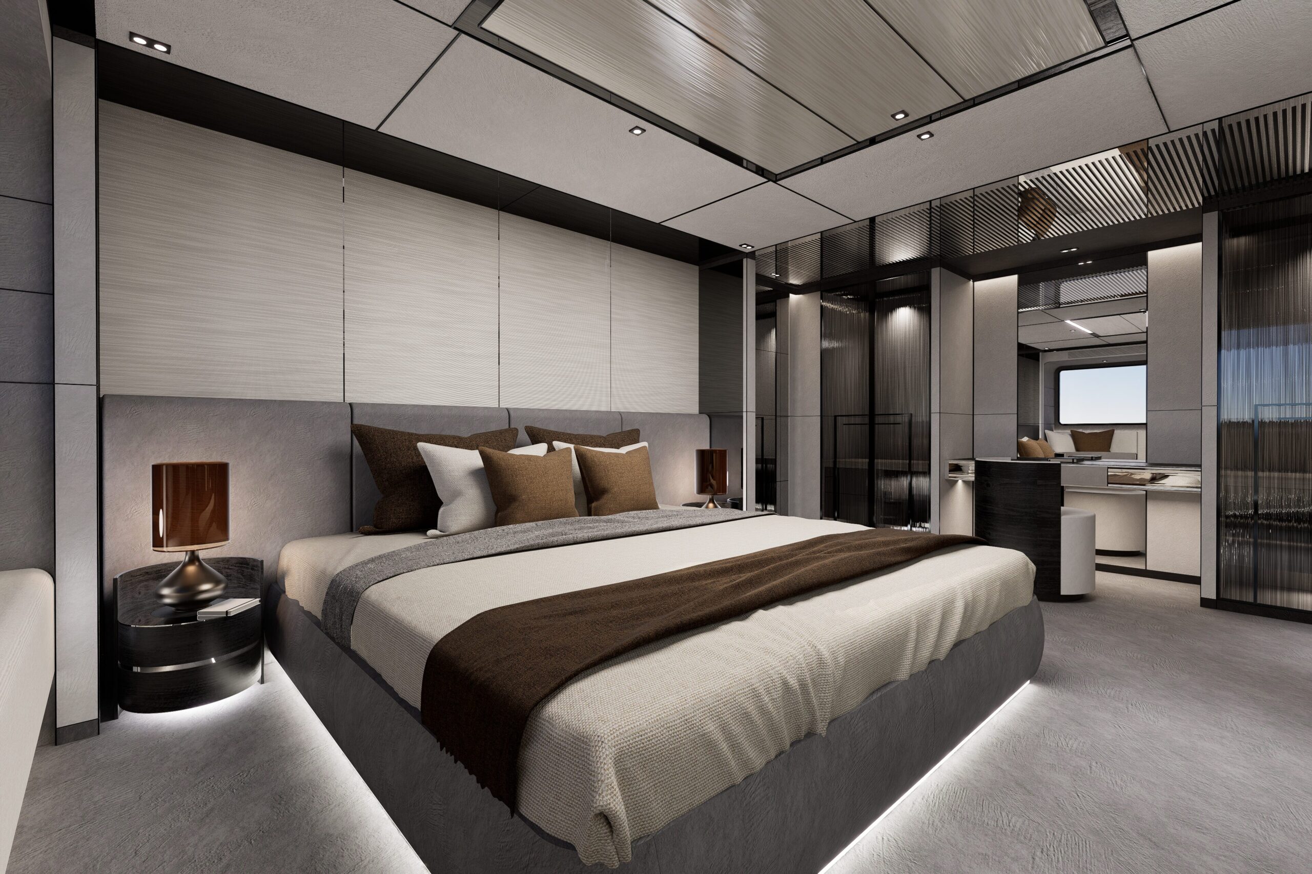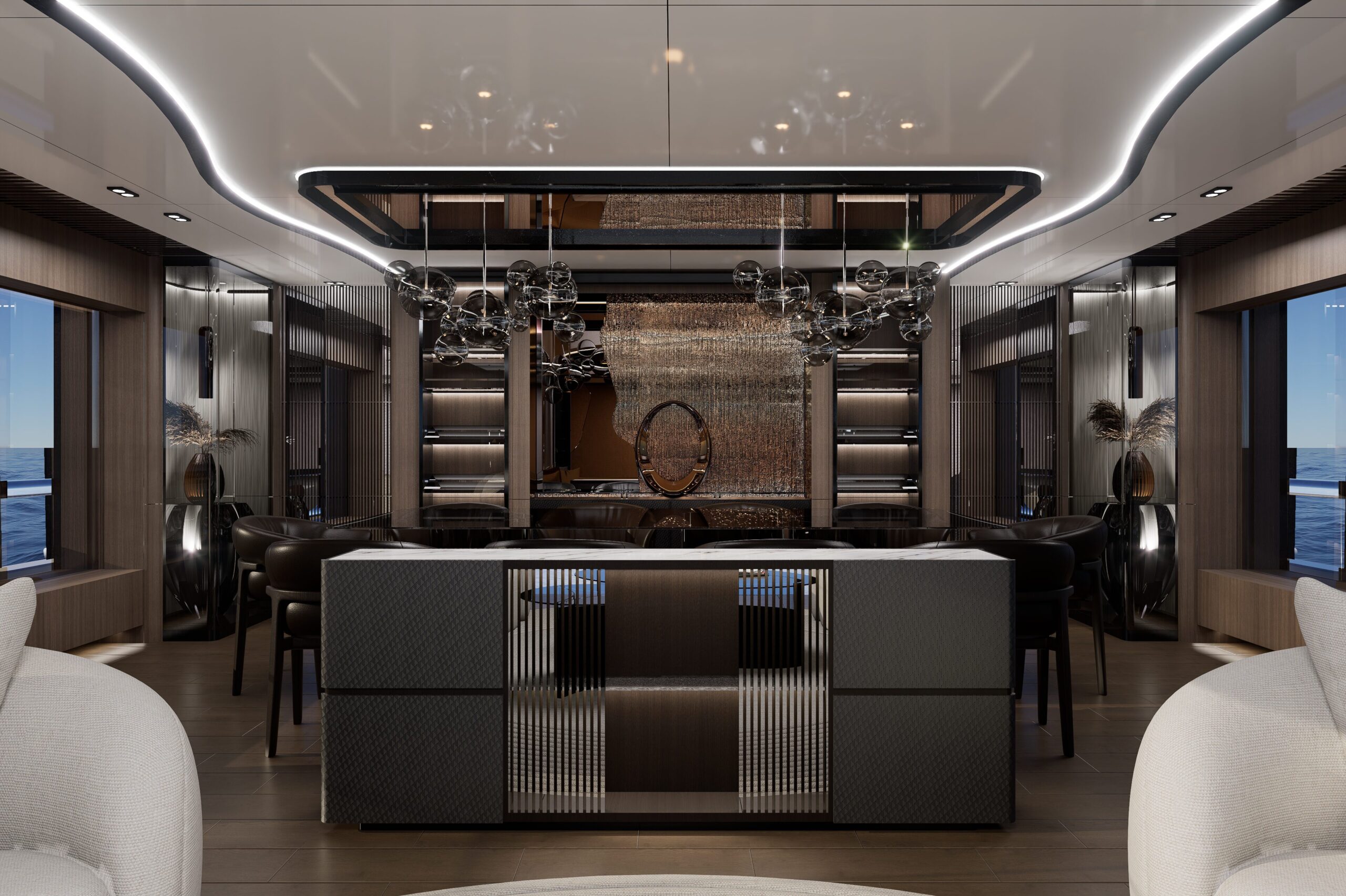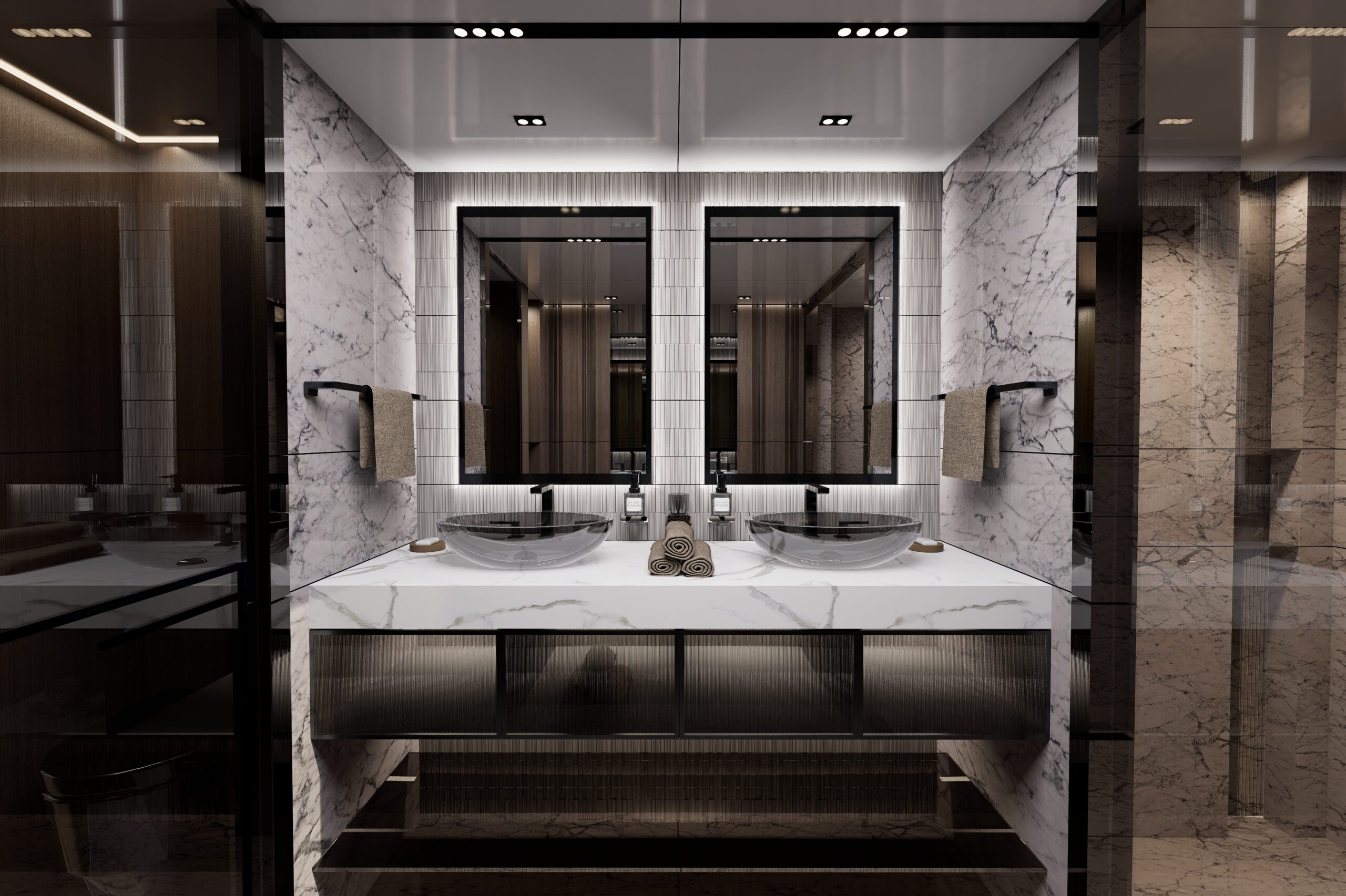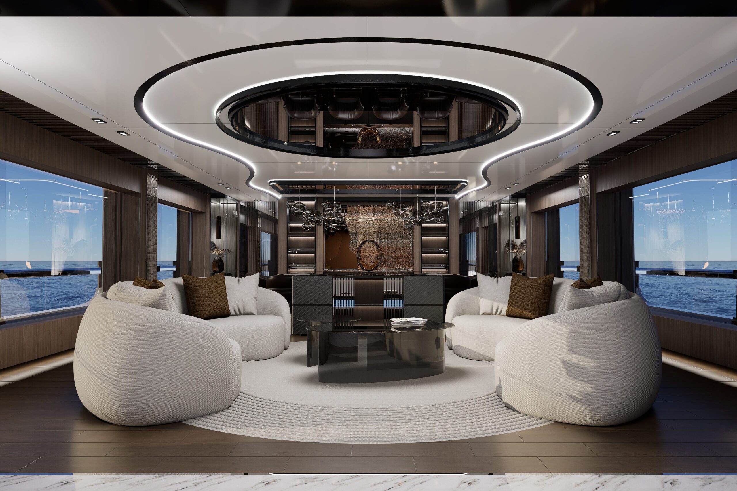 The interplay between reflective and transparent elements further enhances the spatial experience. Bronze mirror finishes capture and diffuse light, introducing movement and luminosity, while darker glass and semi-transparent panels create visual connections between spaces without compromising privacy. Curved geometries play a central role in shaping the interior language, most notably in the main salon where a circular seating arrangement establishes a natural social focal point. This is accentuated by a halo-like ceiling feature, reinforcing the architectural identity of the space.