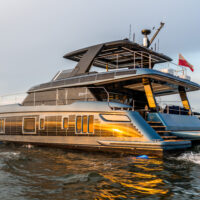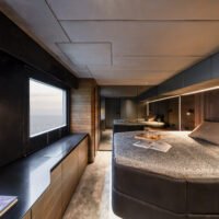 Designed for both relaxation and entertainment, the catamaran’s layout features a semi-open saloon that connects seamlessly with the aft cockpit, creating a bright and airy space bathed in natural light from panoramic glazing and skylights. The aft cockpit spans the full beam of the yacht, merging with the main saloon’s relaxation area, while the hydraulic aft platform doubles as a private beach and facilitates water sports.