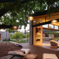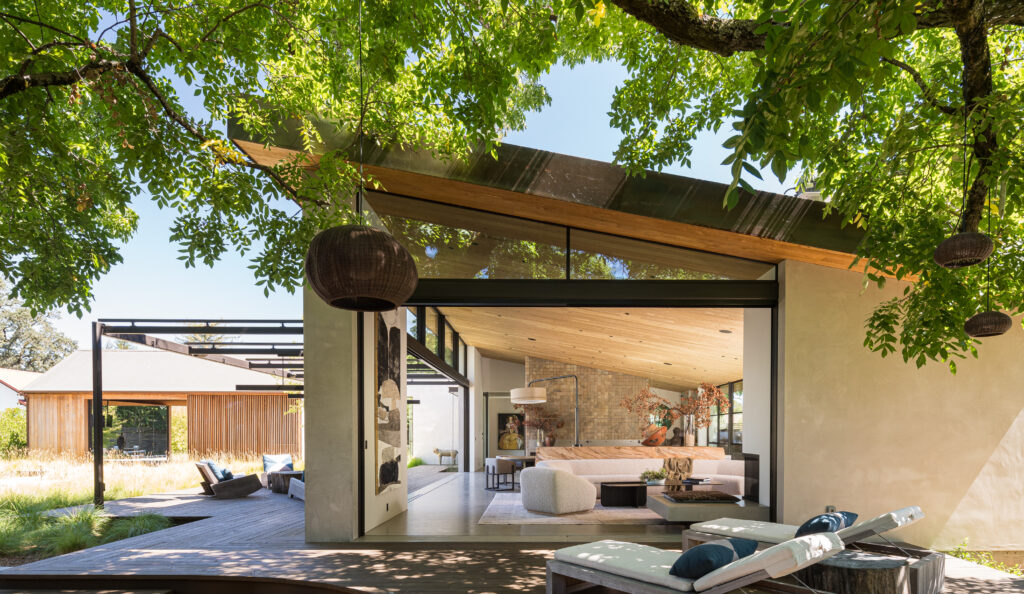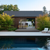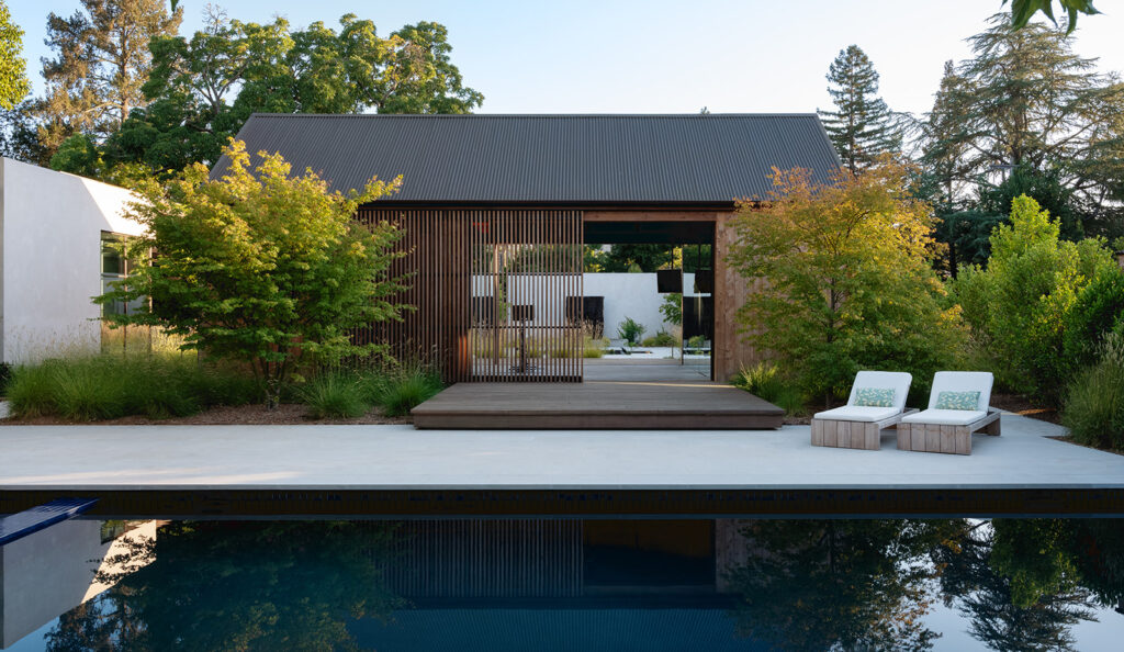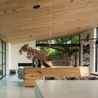 Inside, Martin layers texture and material to evoke both softness and structure. Warm wood ceilings contrast with concrete floors and hand-trowelled plaster walls, while large sliding glass walls open the living space to a series of outdoor rooms including a pond and poolside deck. These zones serve as natural extensions of the interior, offering spaces for relaxation and gathering.