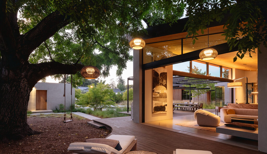 At the heart of Erin Martin’s design are two sculptural features that define the home’s tone. A handcrafted clay tile mural and a 27,000-pound reclaimed eucalyptus log—carved on-site into an integrated furniture piece—act as tactile focal points. These elements ground the design in craftsmanship and reinforce a deep connection to the landscape.
