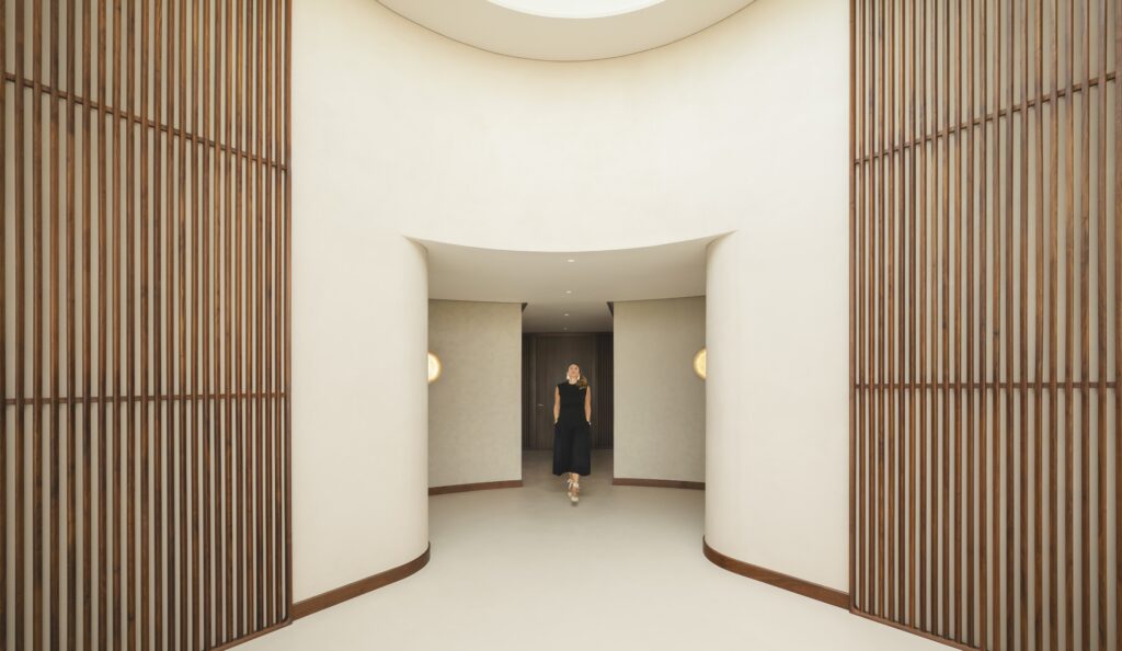 A defining feature is the signature portal—over four meters high, crafted from slatted walnut wood—standing beneath a skylight in the main living area. This monumental entrance pays homage to the name Bab Al Shams, meaning “doors of the sun.”