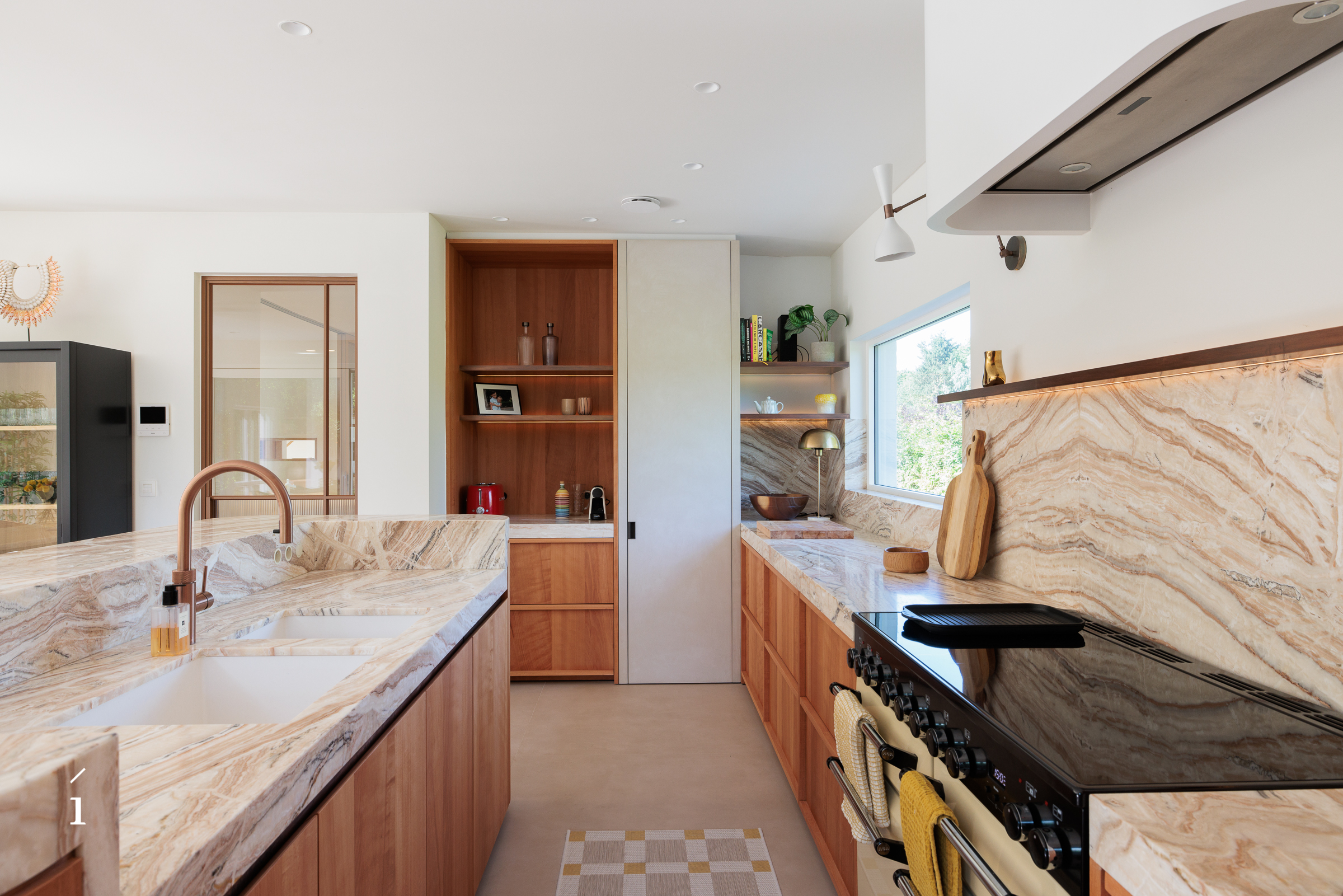 At the heart of the project lies a bespoke eat in kitchen that captures the spirit of a midcentury sunset, evoking the glow of golden light reflected on water. Inspired by Palm Springs aesthetics, Elsine Interiors introduced a honey toned palette that brings a sense of calm and radiance to what was once a dark, north facing space. The kitchen’s design combines bespoke curved carpentry in warm natural wood with sculptural Lanzerone travertine stone and antique brass accents. This interplay of textures and tones creates a sense of harmony, elegance, and craftsmanship that defines the home’s new identity.