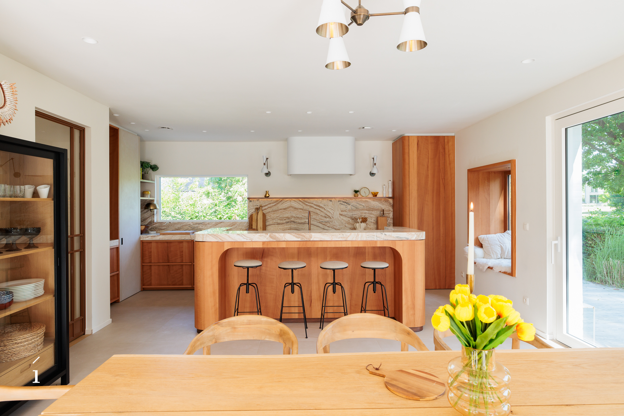 At the heart of the project lies a bespoke eat in kitchen that captures the spirit of a midcentury sunset, evoking the glow of golden light reflected on water. Inspired by Palm Springs aesthetics, Elsine Interiors introduced a honey toned palette that brings a sense of calm and radiance to what was once a dark, north facing space. The kitchen’s design combines bespoke curved carpentry in warm natural wood with sculptural Lanzerone travertine stone and antique brass accents. This interplay of textures and tones creates a sense of harmony, elegance, and craftsmanship that defines the home’s new identity.