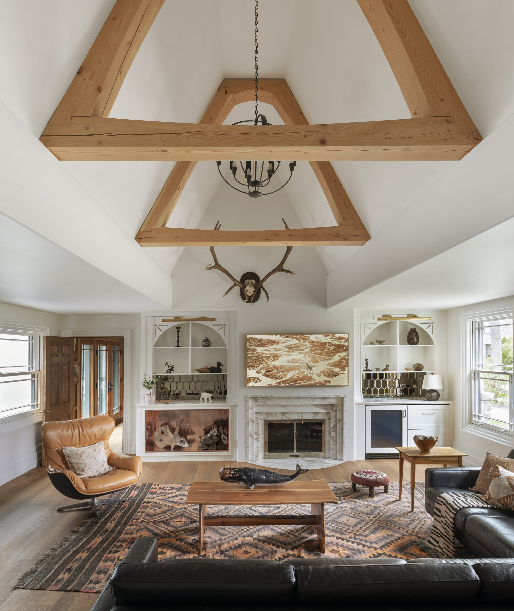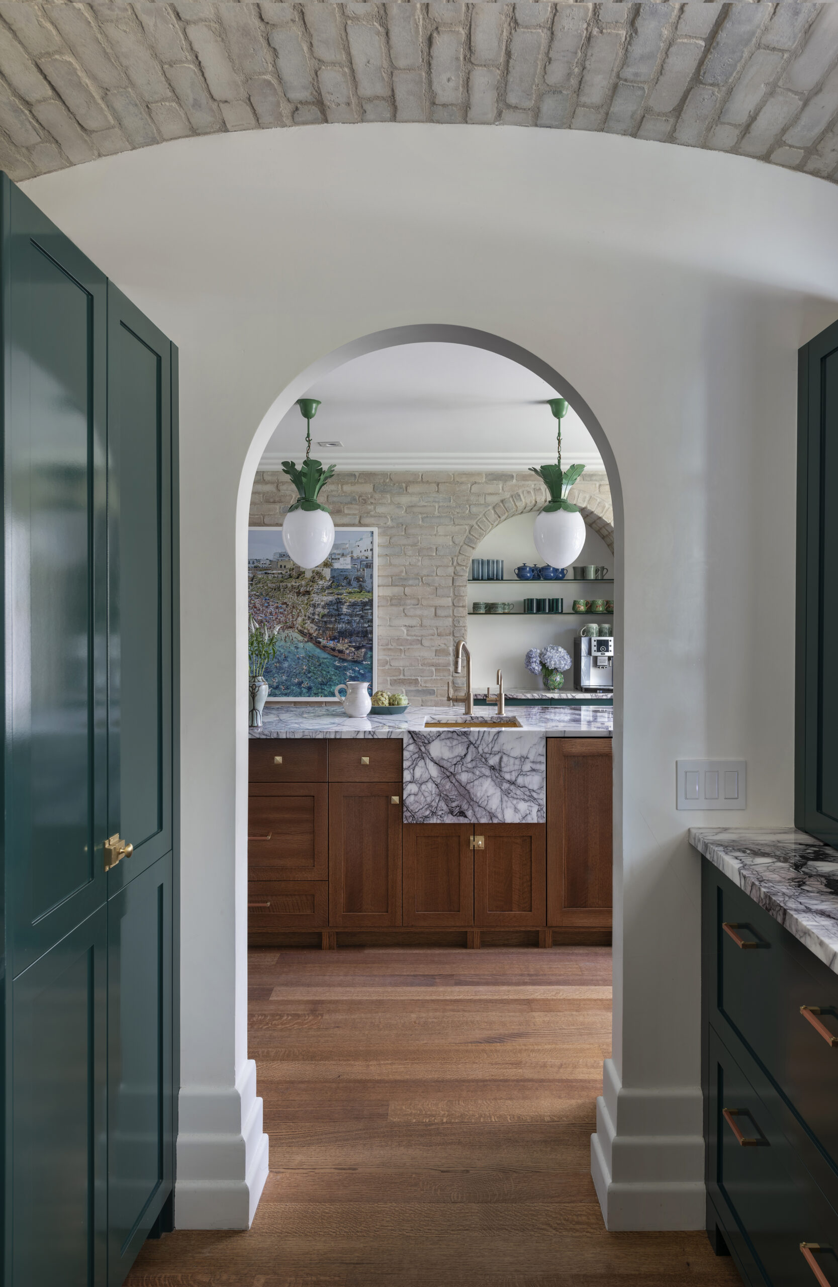 In the kitchen, a complete reworking created three interconnected rooms unified by green tones, lilac veined marble and custom brickwork inspired by a David Burdeny photograph of Matera. Barrel ceilings reference a favourite Sicilian wine bar. Throughout, noble materials including marble, oak and Douglas Fir, deep coffers, bespoke beams and globally sourced finishes elevate the home, uniting art, architecture and craftsmanship in a richly layered, cohesive whole.