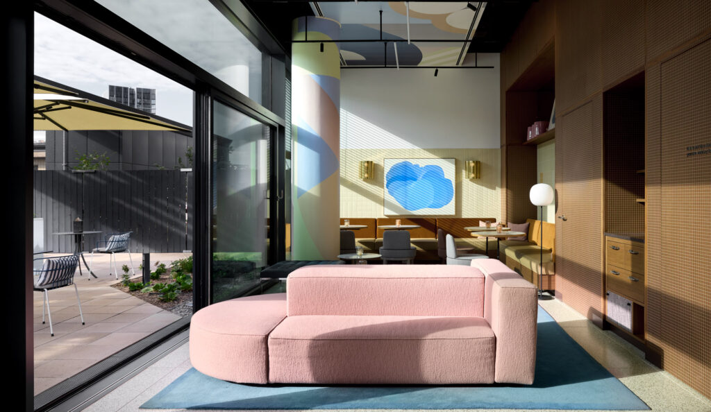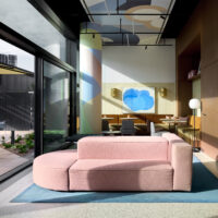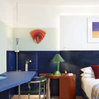 The design brief called for spaces that are eclectic and approachable, with bold shapes and raw yet refined materials. Waldo Works responded by weaving together handcrafted modernism and desaturated colour blocking to give the hotel a clear identity. The guest rooms embody this philosophy, featuring clean geometric lines, tactile materials, and a playful mix of colours such as rust, blue, and emerald green. Each room feels individual, blending comfort with visual intrigue and a sense of humour.