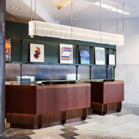 In the public areas, Waldo Works embraced contrast to create a dramatic yet welcoming ambiance. The lobby juxtaposes cool chrome and crystal with rich green and red marble, velvet, and dark mahogany wood, evoking a sense of institutional elegance rooted in the 1950s. This refined aesthetic carries into ANNI, the hotel’s brasserie restaurant, which channels the charm of classic European cafés and traditional Italian American bistros. Black and white tiles inspired by Anni Albers, unique pendant lighting, and curated portraits contribute to the layered, cosmopolitan atmosphere.