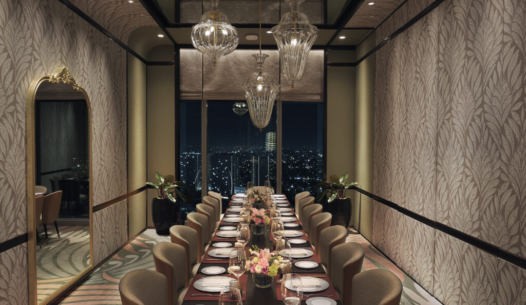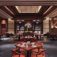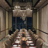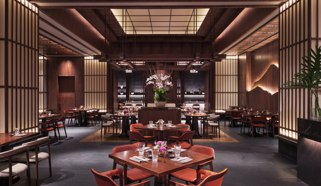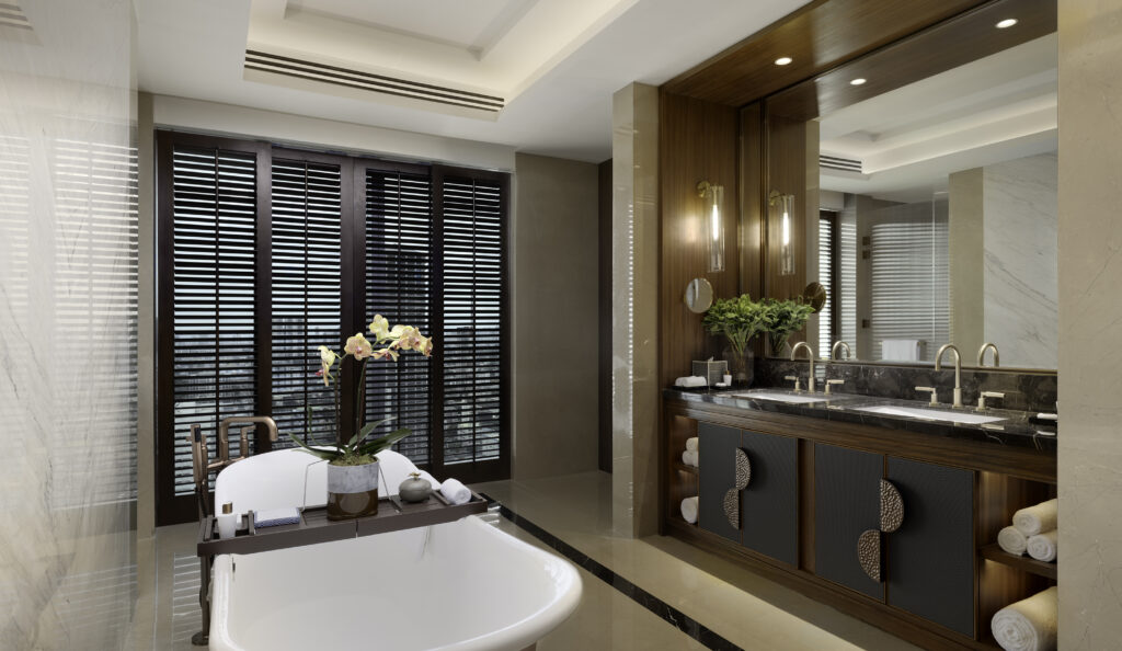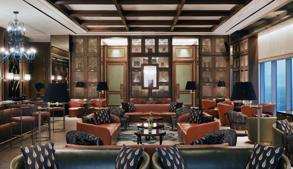 Signature restaurants include Yakumi, where shadow and timber details create an intimate Japanese setting; Red Lantern, a lavish Chinese dining space; and Finestra, which crowns the top level with its dramatic theatre kitchen and rich interiors. The Sky Bar offers a reinterpretation of a Western club, complete with wine and cigar vaults and a rooftop terrace designed as a room in the sky.
