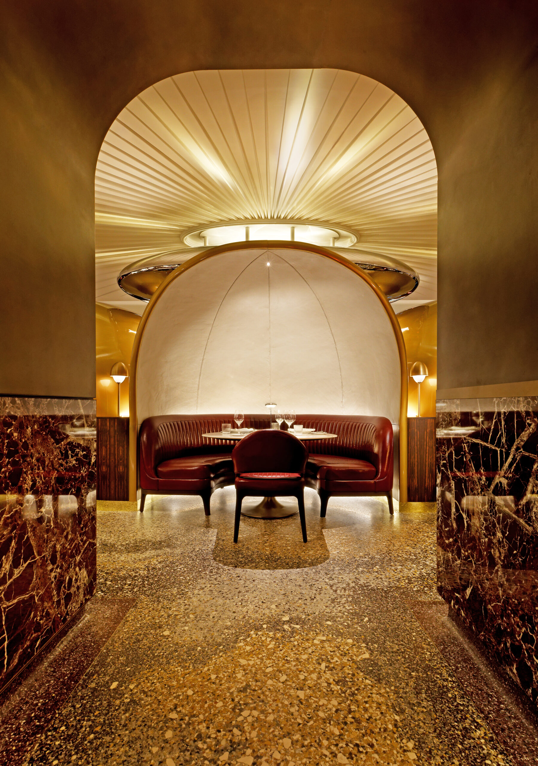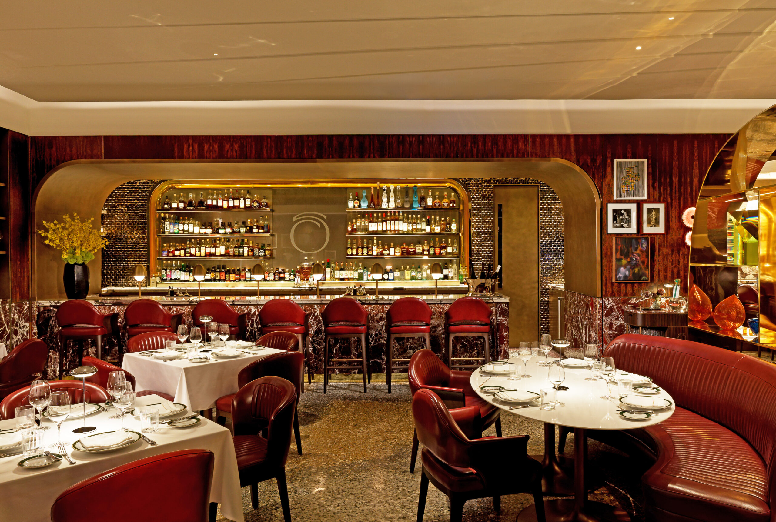 Guests enter through an amber glass portal into a palette of deep timbers, rich burgundies, and wine-soaked reds. The bar and lounge evoke an Italian wine cellar, while the central fountain and suspended polished orb create a theatrical centerpiece for intimate dining experiences. Handcrafted plaster ceilings, locally sourced bespoke wood, stone, and metalwork, and furniture upholstered in fine leather ensure every element reflects generations of artisanal skill.