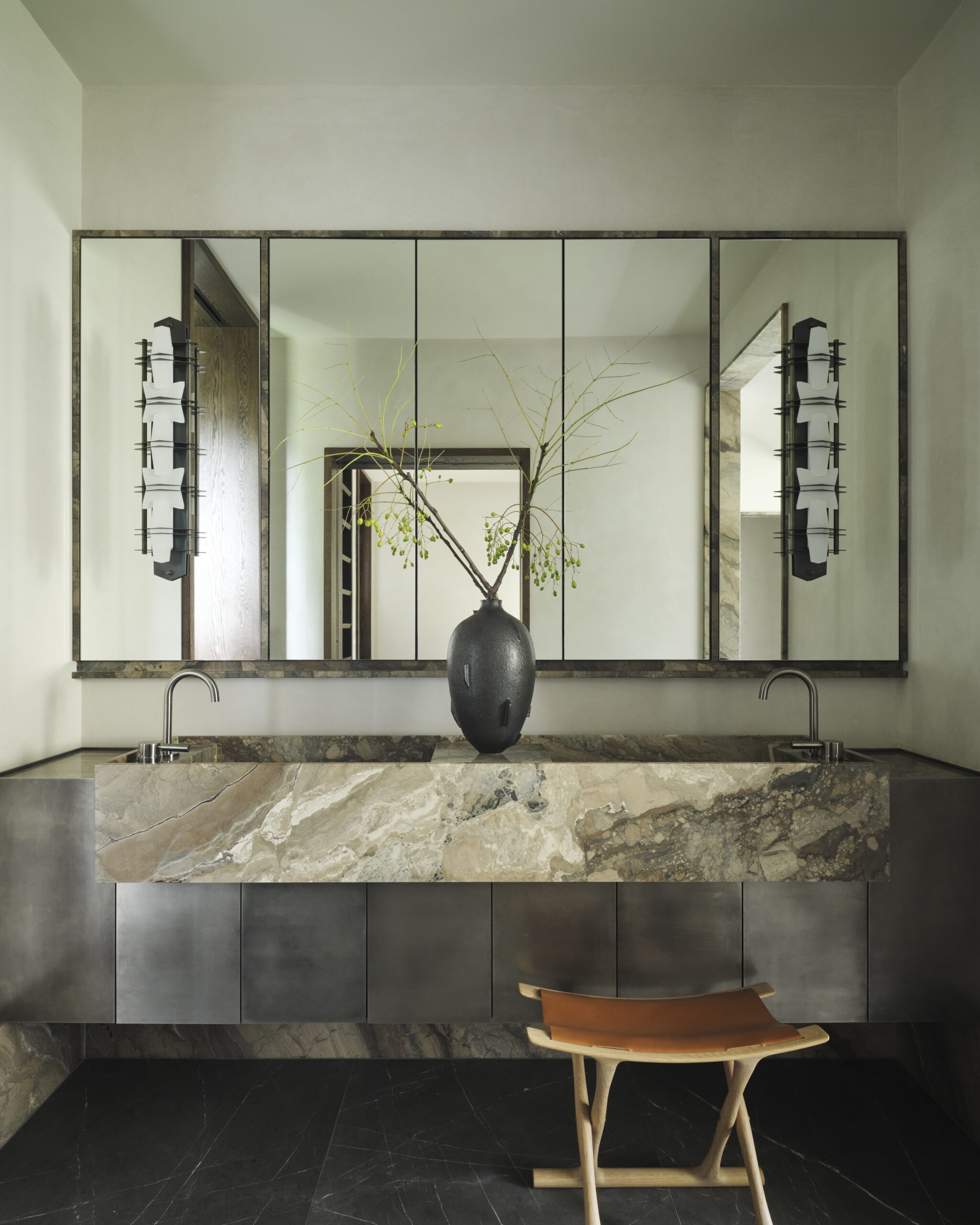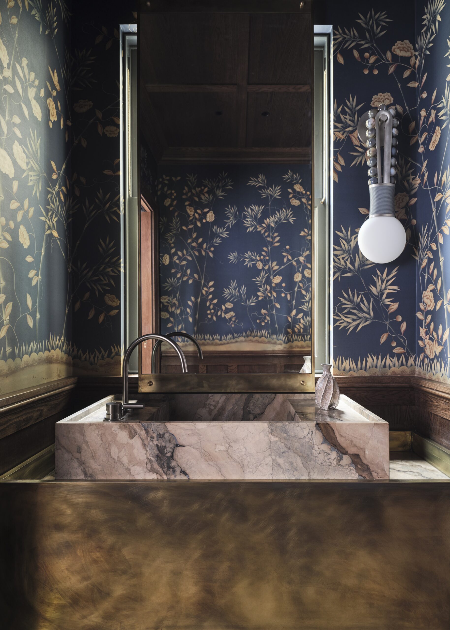 Jillian Dinkel reconfigured the traditional floor plan, replacing surplus bedrooms with purpose-built spaces including a serene art studio, a spa-like wellness retreat, and a moody rumpus room for social gatherings. Throughout, velvet-clad furniture, sculptural lighting, artisanal tiles, and jewel-toned finishes infuse the interiors with layered richness, while natural stone, solid timber, and hand-applied finishes honour the home’s early twentieth-century character.