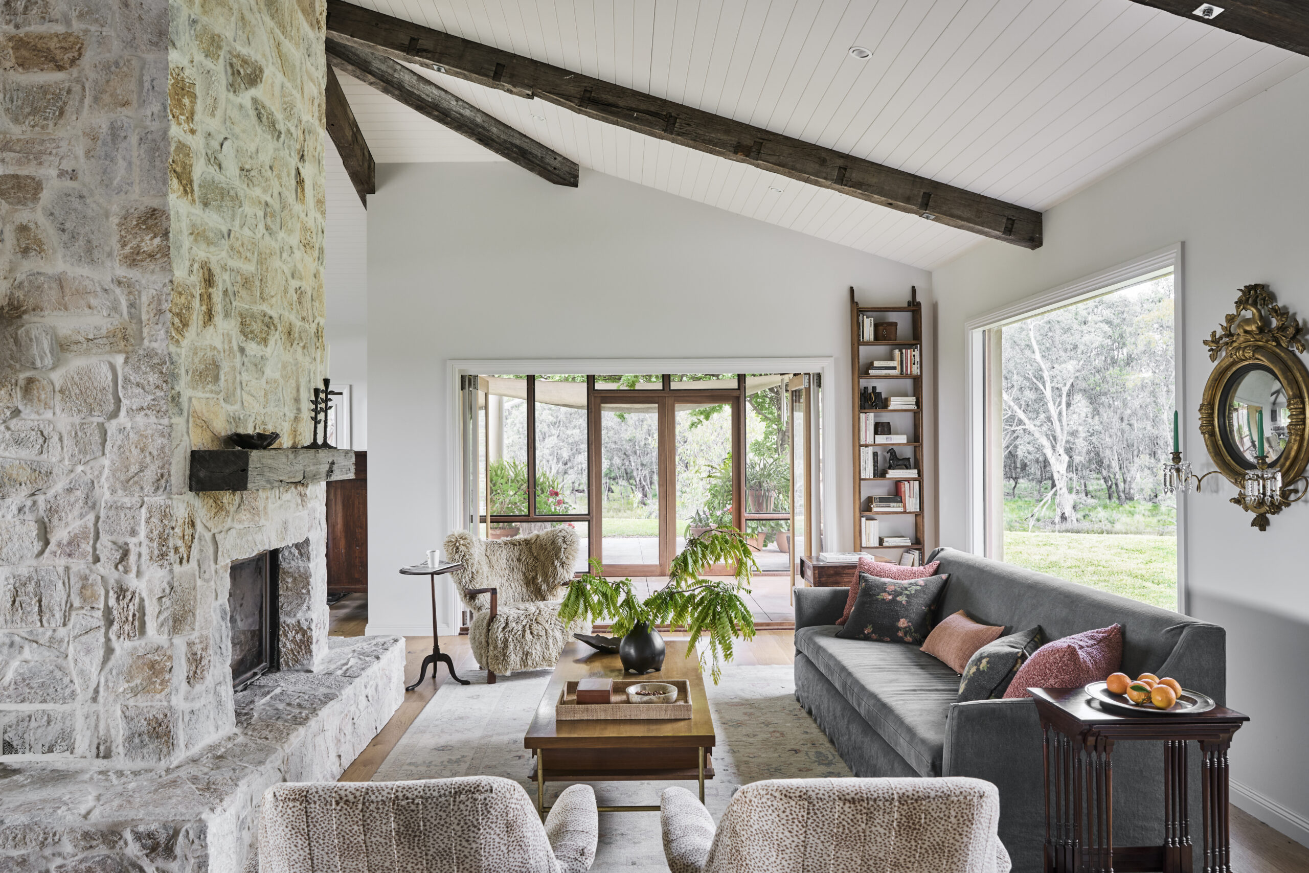 Kate Nixon introduced a strong material narrative centred on natural stone, incorporating it into the bathroom, central fireplace and kitchen to unify the home. The kitchen, reflecting the client’s passion for cooking and entertaining, became pivotal to the redesign. Kate Nixon added an island bench, substantial storage and a separate larder, while a stone wall behind the cooktop anchors the space and showcases treasured cookware passed down through generations. Tongue and groove panelled ceilings with rustic beams canopy the living area, seamlessly connecting to the open plan kitchen.