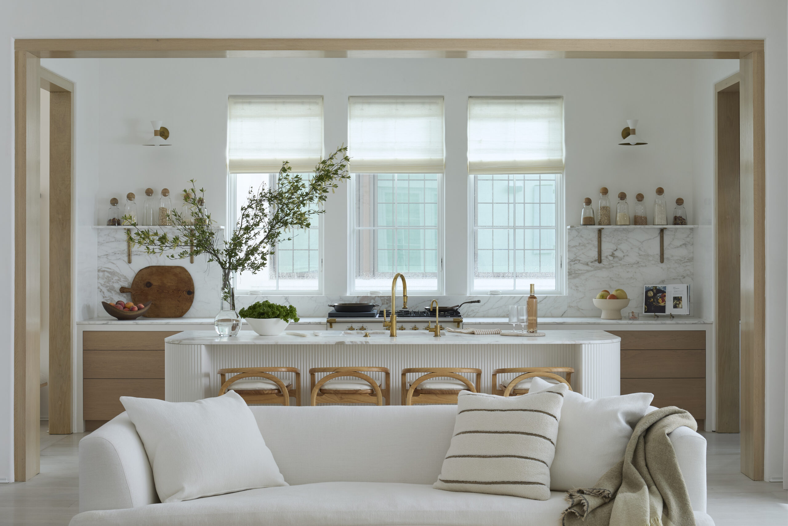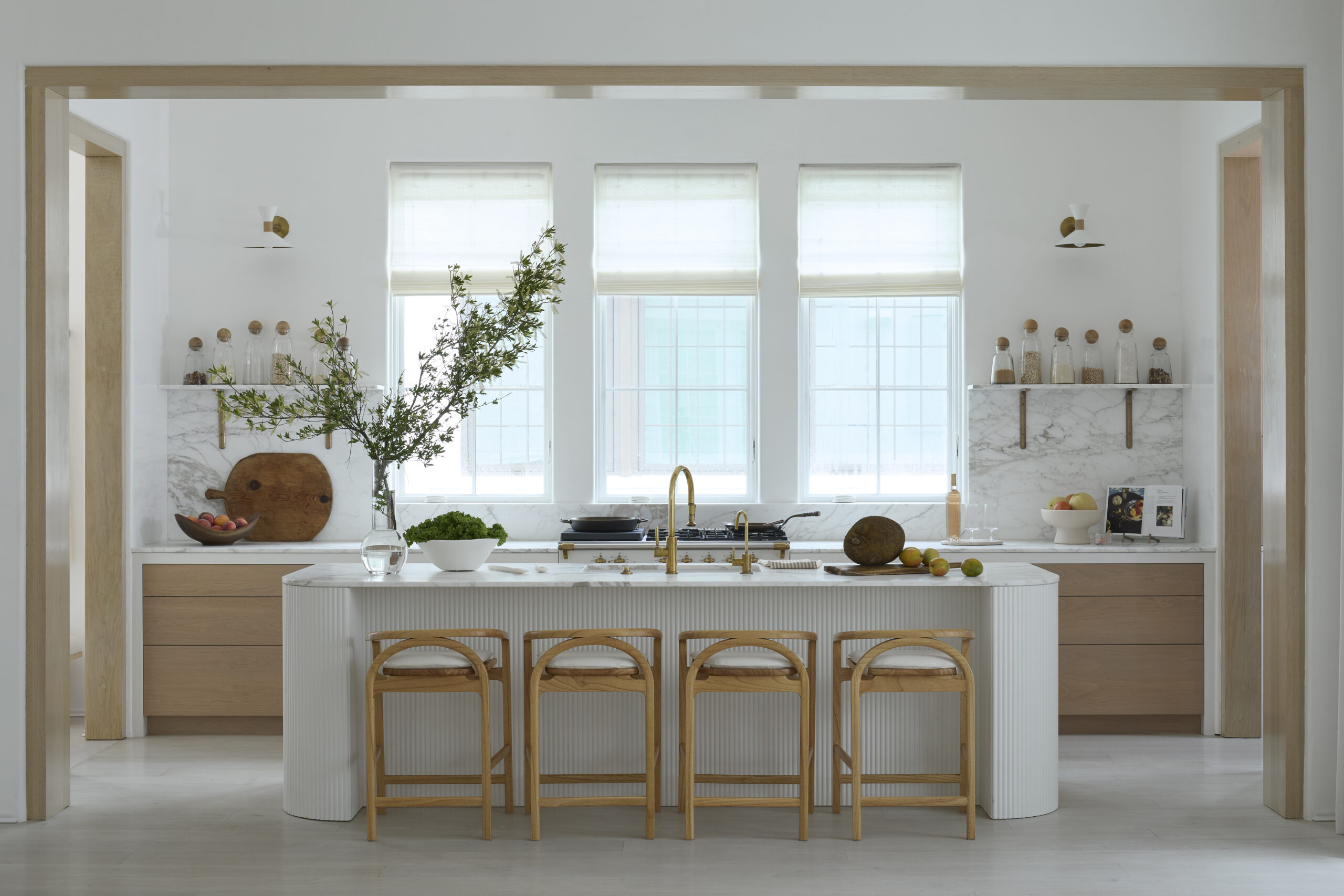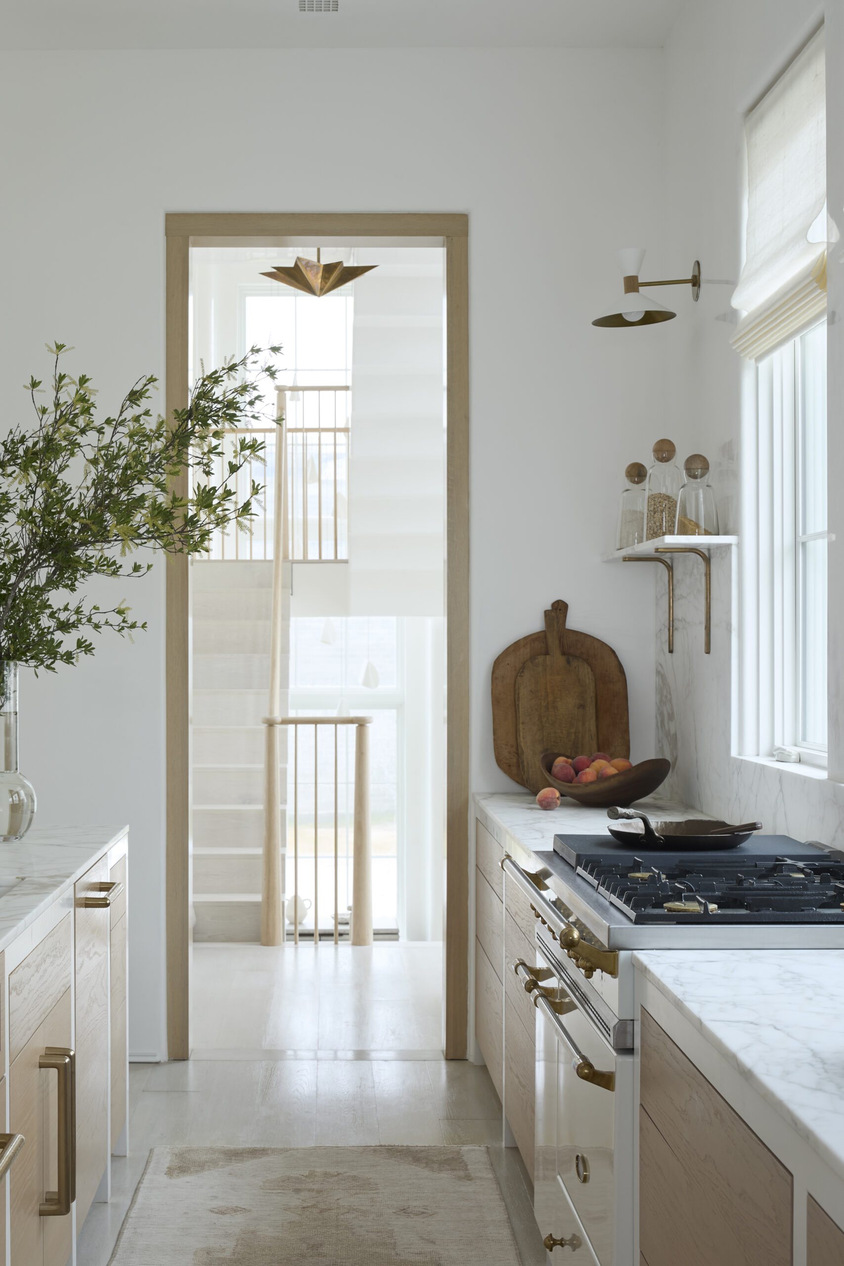 A dramatic entry hall defined by plaster groin vaults leads to a sculptural stair that ascends toward natural light. The intermediate landing opens to a private courtyard, where a pool set at the lot’s edge visually connects to the sea. The second floor features a luminous kitchen bridging the courtyard and Great Room, extending to a shaded loggia with oblique Gulf views.