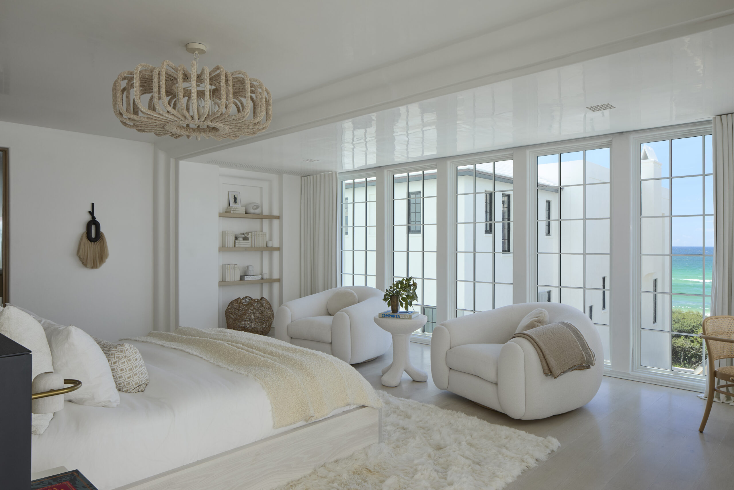The town’s master plan encourages density while preserving Gulf vistas across multiple rows of homes. Within this framework, the site’s modest footprint is offset by its allowance for three levels, creating a vertical townhouse composition. The main living areas occupy the second floor, the primary suite resides on the third, and a roof terrace crowns the structure, capturing sweeping views of both the Gulf and the whitewashed townscape.