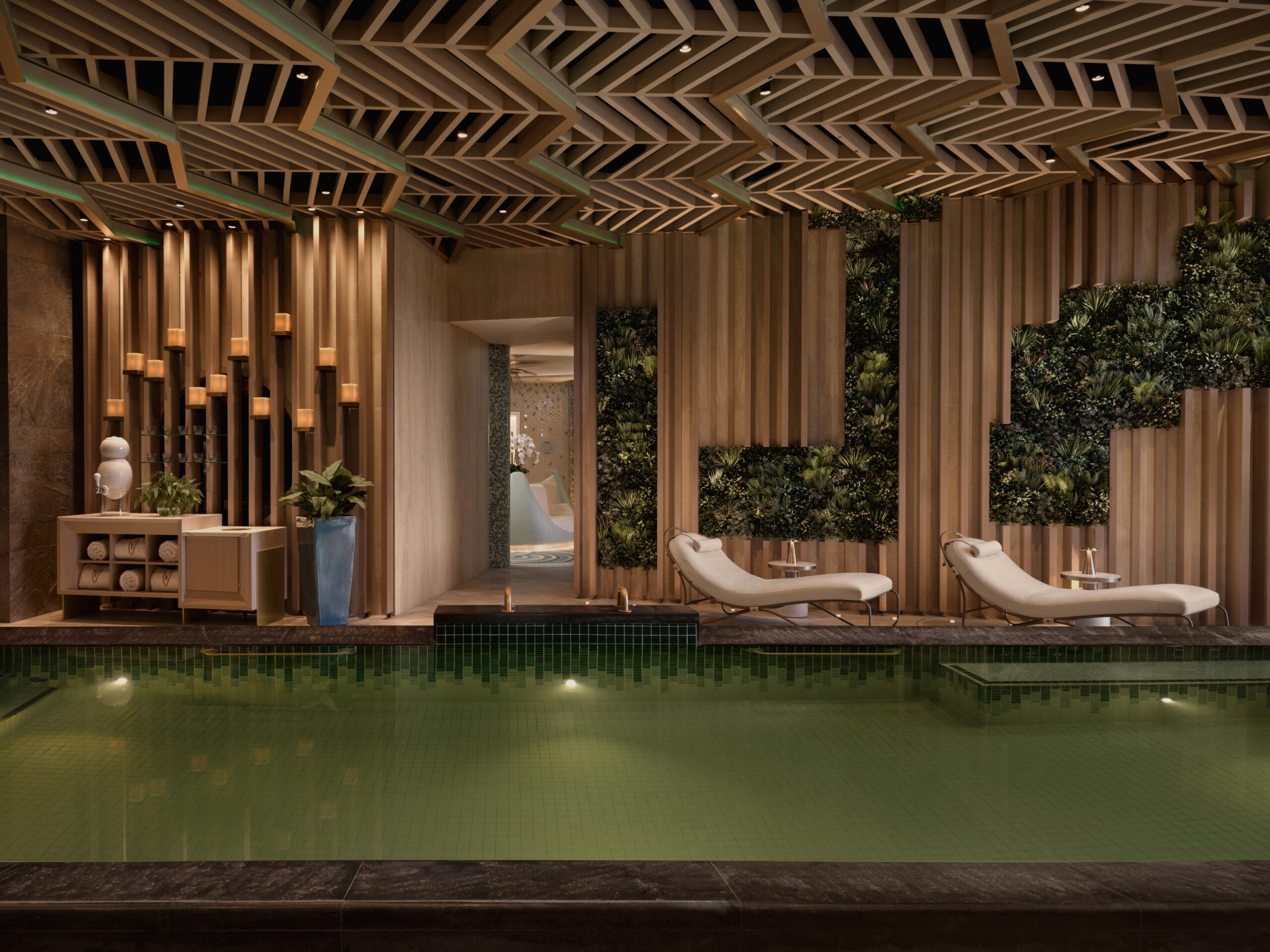 At the heart of Meraki Wellness is the 2,500 square foot Mineral Pool, composed of 33,986 handmade green tiles symbolising renewal. With infinity edges on three sides, integrated hydro jets, champagne benches and aqua bikes, the pool supports both restorative and active experiences. A custom designed ceiling, wider at the entrance and narrowing toward the window, enhances movement and frames the pool as the defining centrepiece of this transformative wellness retreat.