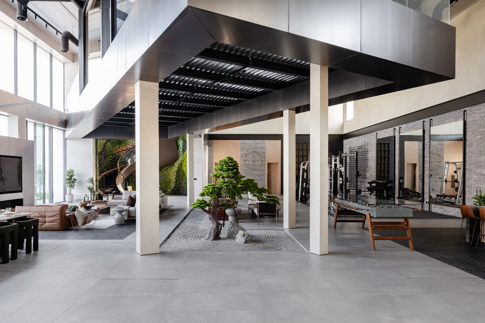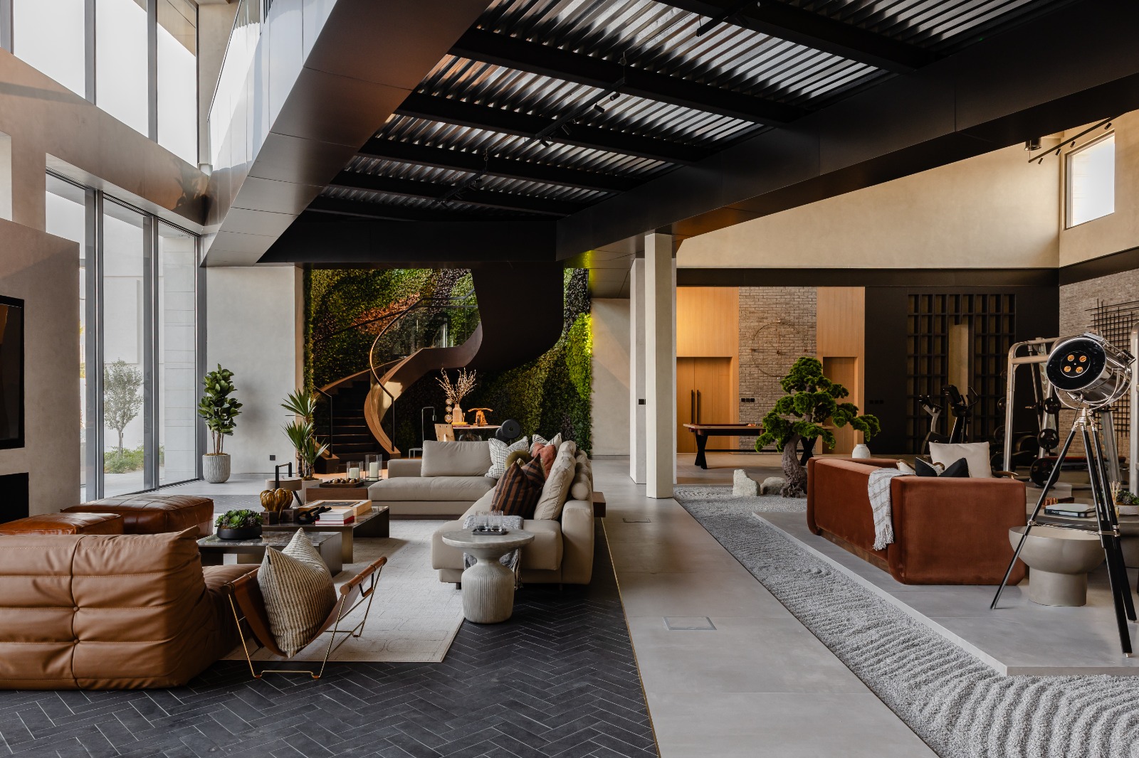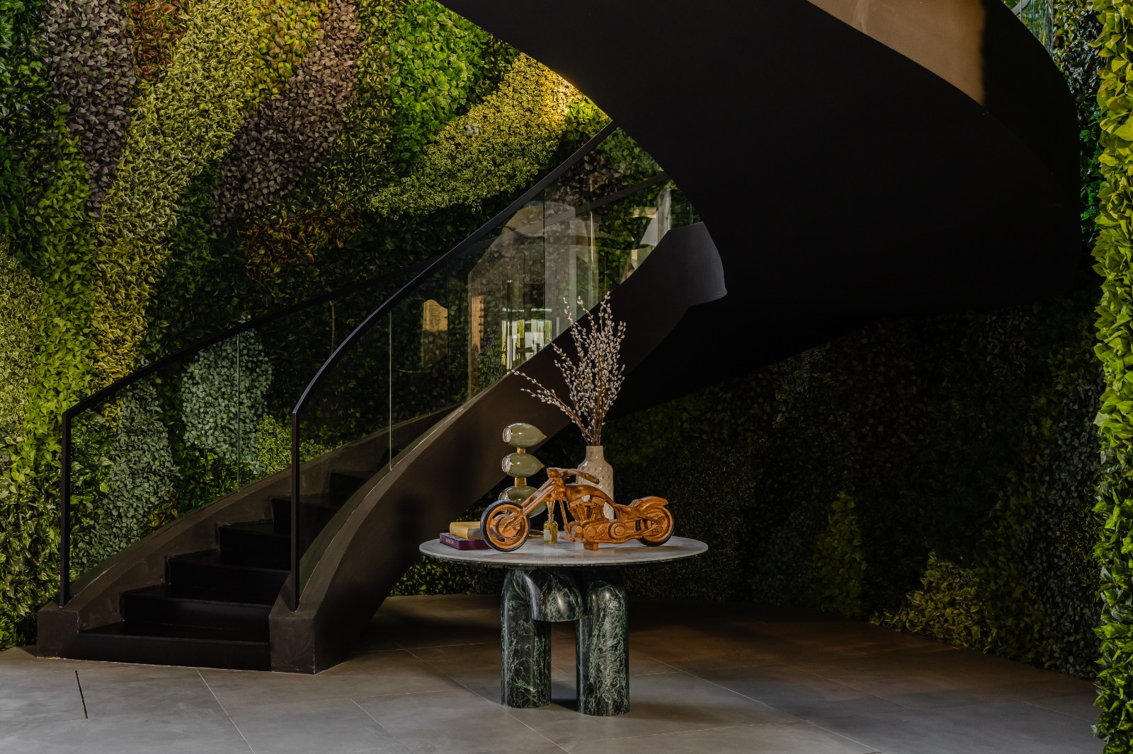 Internally, O Two Decoration Design & Implementation LLC adopts an industrial inspired aesthetic built on material honesty and restraint. Concrete finishes, metal accents and exposed textures create a masculine, robust atmosphere, softened through bespoke furniture, curated art and layered lighting to maintain warmth. A dramatic green wall forms the heart of the villa, introducing biophilia into the industrial narrative. A sculptural spiral staircase weaves through this vertical garden, becoming both a functional connector and a visual centrepiece.