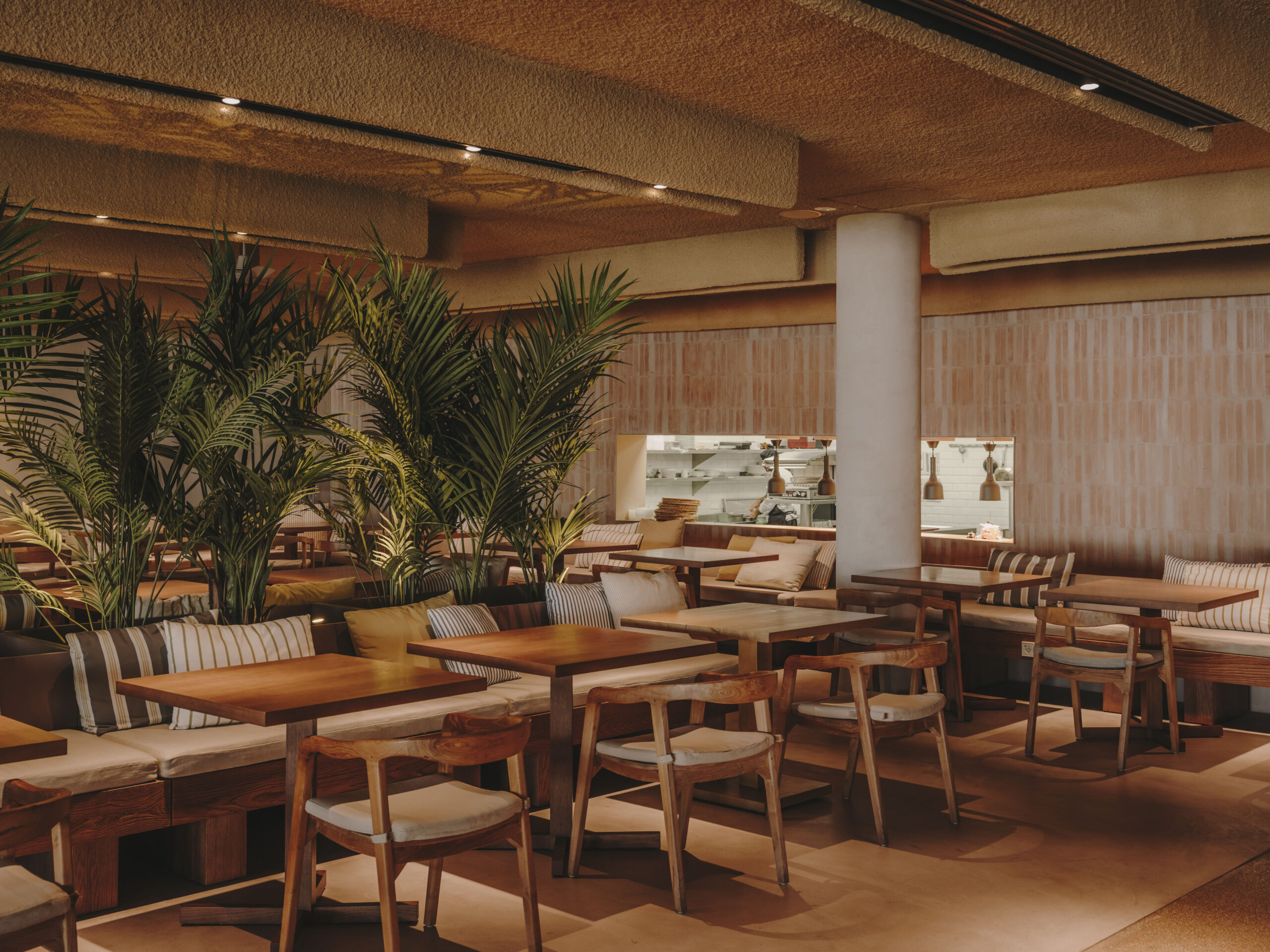 Natural materials such as wood, stone, and terracotta define the palette, complemented by Mediterranean vegetation and handmade pieces from Mallorca. The central sculptural feature, inspired by the desert rose, was created with artist Ramón de los Heros, who developed a unique material replicating the texture of the natural stone.