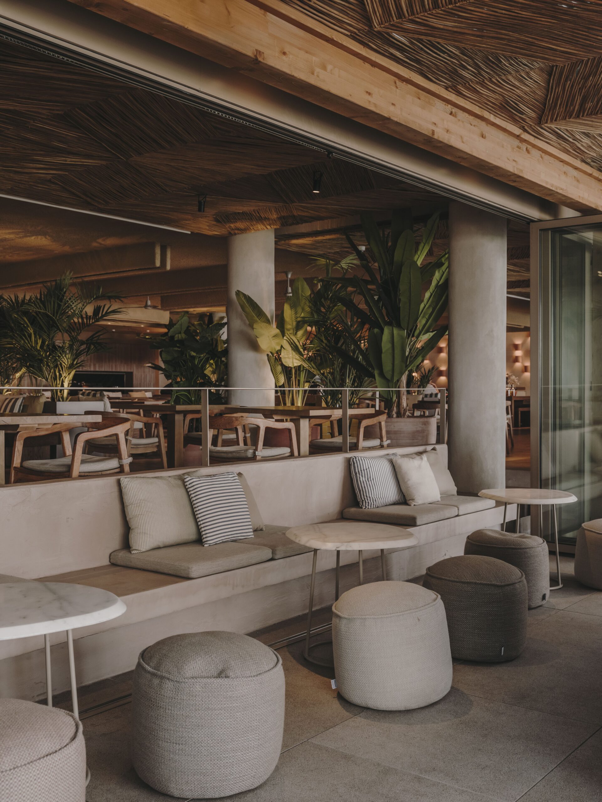 Natural materials such as wood, stone, and terracotta define the palette, complemented by Mediterranean vegetation and handmade pieces from Mallorca. The central sculptural feature, inspired by the desert rose, was created with artist Ramón de los Heros, who developed a unique material replicating the texture of the natural stone.