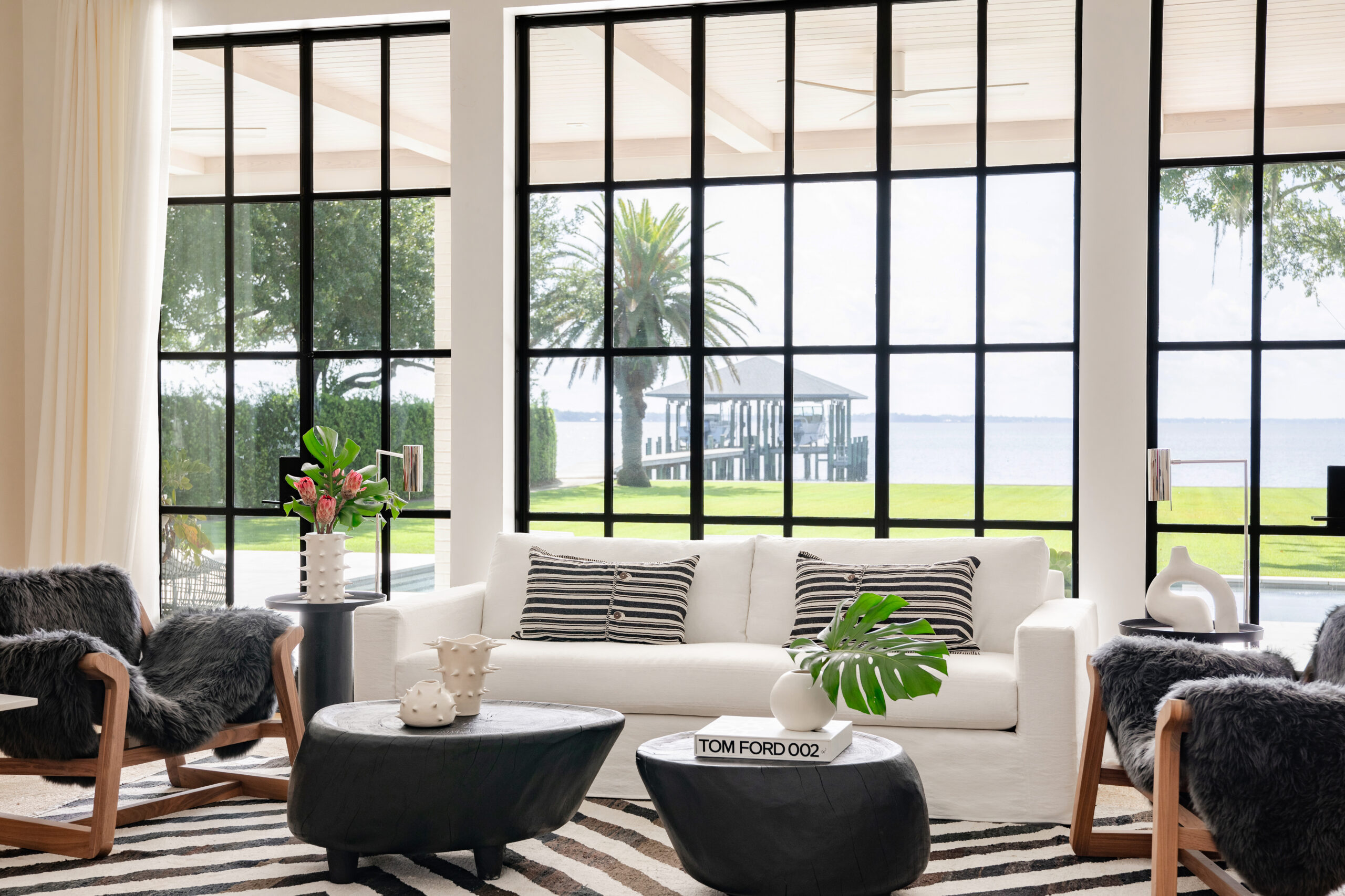 The home’s setting played a critical role in shaping the design. Mature tree coverage and expansive river views were intentionally leveraged to support a casually elegant lifestyle with a strong emphasis on indoor–outdoor living. Large expanses of glass and steel-framed windows, integral to the original design concept, create powerful visual connections to the river, including axial views extending down the driveway and through the interior spaces. These transparent elements reinforce a sense of openness and continuity with the surrounding landscape.