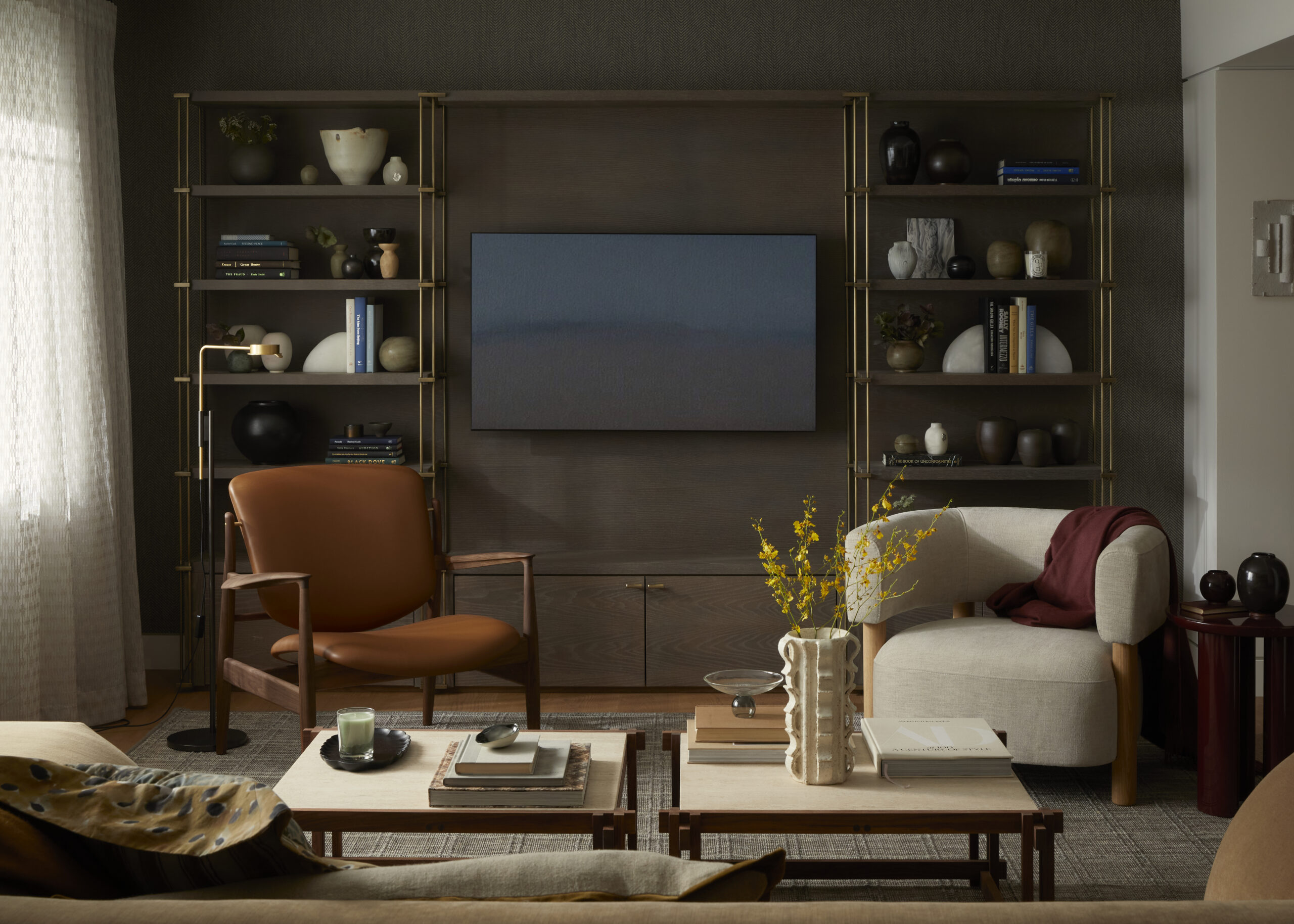 To the rear, a corridor lined with bespoke shelving and nature-inspired wallpaper opens towards the ravine, merging the home’s refined interior with the surrounding landscape. Studio Otty collaborated with skilled millworkers and small fabricators to create the cabinetry, custom vanity, shelving, art plinth and wine rack, ensuring craftsmanship and timeless appeal throughout.