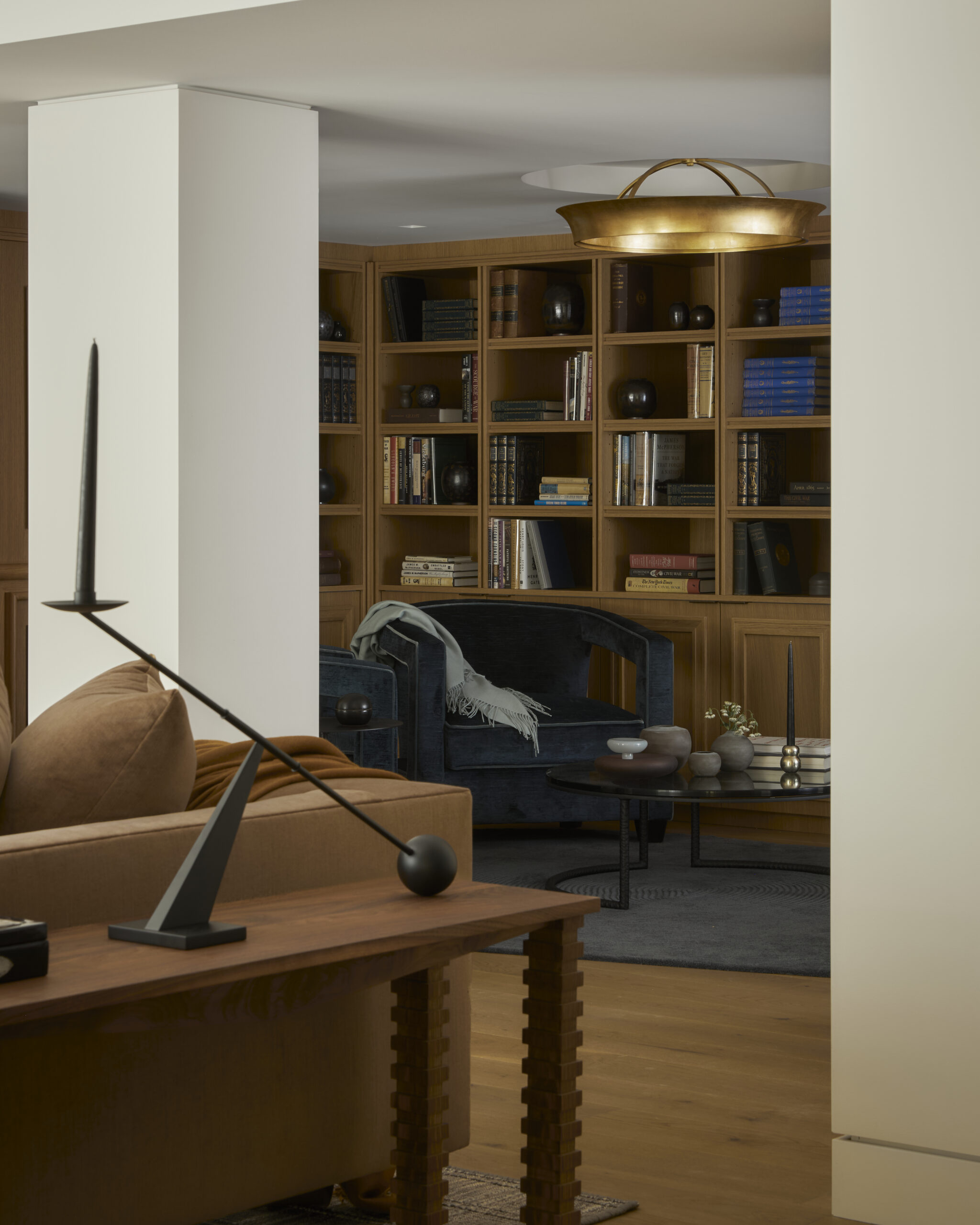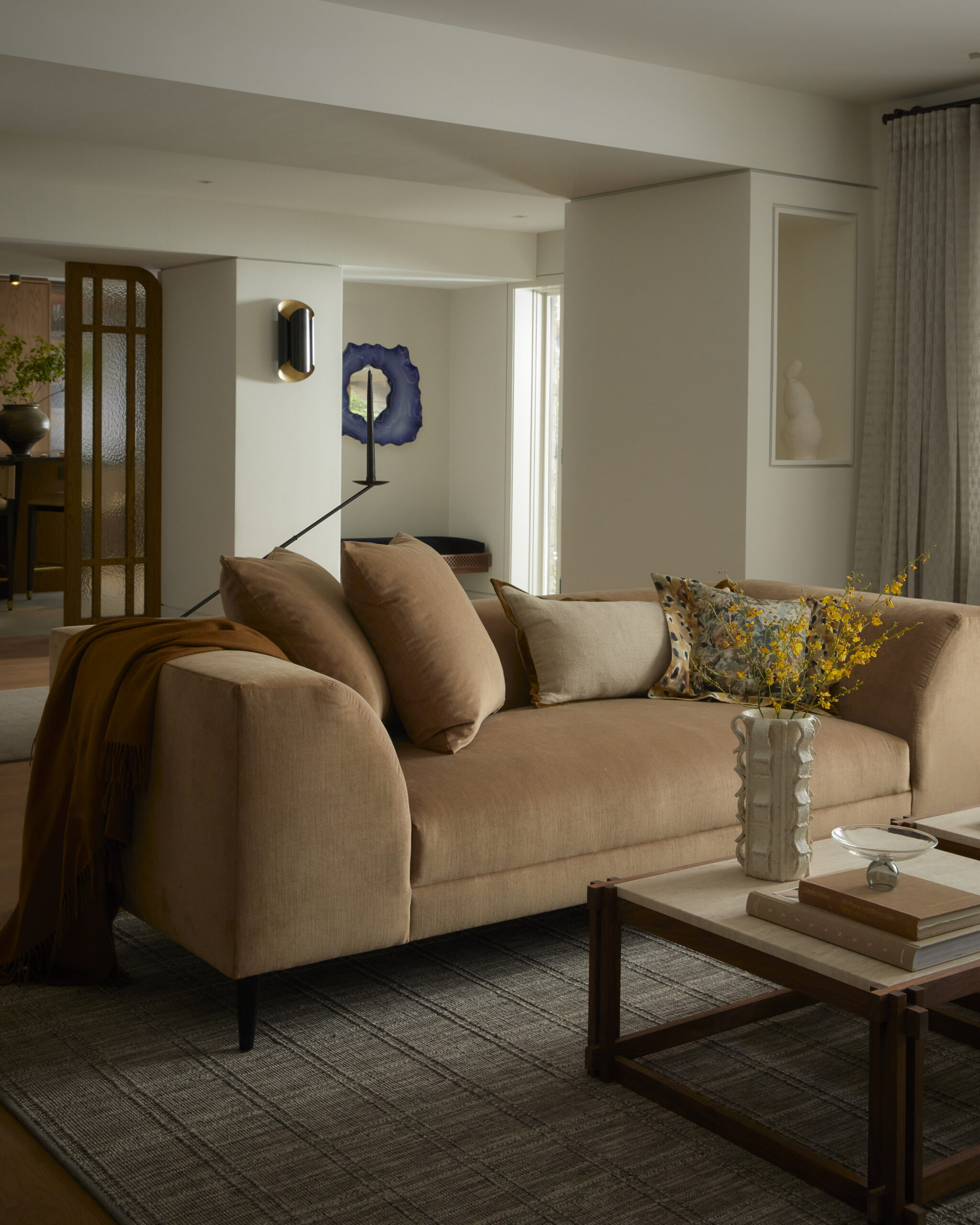 Paperweave House by Studio Otty is an architectural symphony of art, light and craft. Sculpted forms, warm materials and a quiet rhythm define this refined collector’s retreat. Designed for a discerning art and book collector, the home unfolds along a central hallway softened by a custom ombré runner and anchored by a sculptural cast-concrete sink delicately balanced on high-gloss lacquered oak legs. A procession of columns and decorative sconces along this spine creates a sense of gentle monumentality.