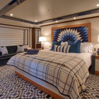 A crucial aspect of any project is how the spaces flow together to make the interior areas a continuous thread of the design. Claudette Bonville Associates, Inc. ensure this by running themes throughout all aspects of the design. The carpeting is custom designed to flow throughout the boat. Lower guest rooms feature a beautiful silk/wool combination plaid that has all the colour of the staterooms. This allows the staterooms to be individual coloured but the carpet which features all the colours, connects them together.