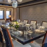 Contemporary fixtures are added to create elegant yet homely atmosphere. Custom designed leather furniture embroidered Italian linens and cashmere throws complete the guest cabins. The dining room’s exceptional glass stable and chandelier sets it apart from most interior and adds a showstopping touch, and the leather padded walls add a softness and unique touch to the crisp interior.