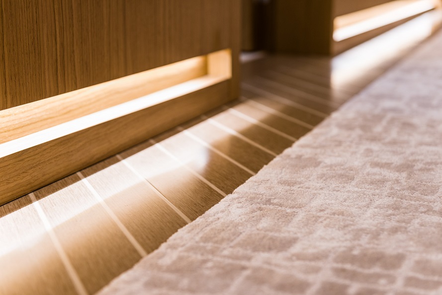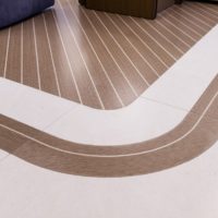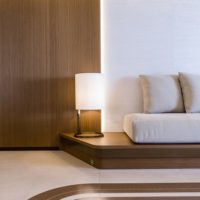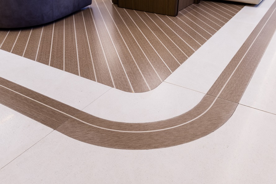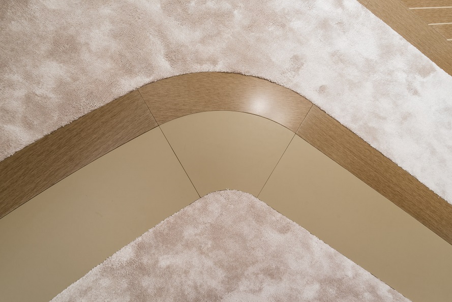 Classic elegance with a warm and calm interior. The client specifically instructed Luxury Projects that the design and actual execution needed to be absolutely faithful. Right from the drafting of the project into the choice of furnishing and materials, all furniture, fabrics, soft furnishings, flooring and lighting are custom made materials specifically for this project M/Y Alkhor. Each piece has been made by artisans of the province of Marche, which is a fashion and luxury furniture district. To ensure a homely feeling, and since the owner specifically instructed the designers not to use any rugs, Luxury Projects needed to invent other ways to enrich the design of the flooring and create some “movement”. They created decorative floor motifs with materials such as marble/stone, parquet, carpeting, leather, creating “chevron” patterns and lines that give movement throughout the yacht.