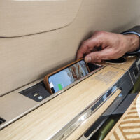 This teamwork came to fruition with a sleeker design across the cabin from the size of latches to the leather quilting. Durability and versatility describe the fold down seats that have intentional material to support weight of baggage without harming the luxurious leather of the seatback. The entry step boasts a similar material with longevity in mind. Newly designed lighting inside the cabin as well as the entry steps increase awareness in dark settings while also adding unmatched ramp appeal. A convenient, user-friendly cabin management system allows the individual to adjust any of these factors to their liking. Adding additional device charging capabilities and bringing wireless charging first to market allows the users to be as productive as they choose.