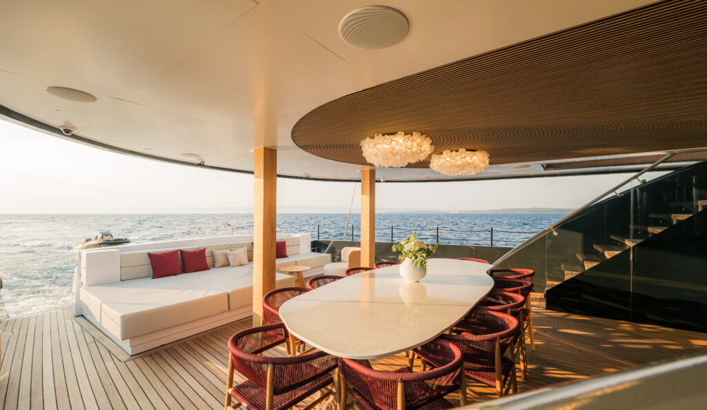 At the stern, guests are welcomed by immaculate teak decking leading to a spacious beach club, where a variety of water toys and a chase boat await. The aft deck, sheltered by the flybridge overhang, provides a protected dining area with alfresco seating for 12, as well as a comfortable lounge furnished with plush sofas and occasional chairs.