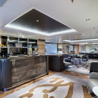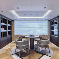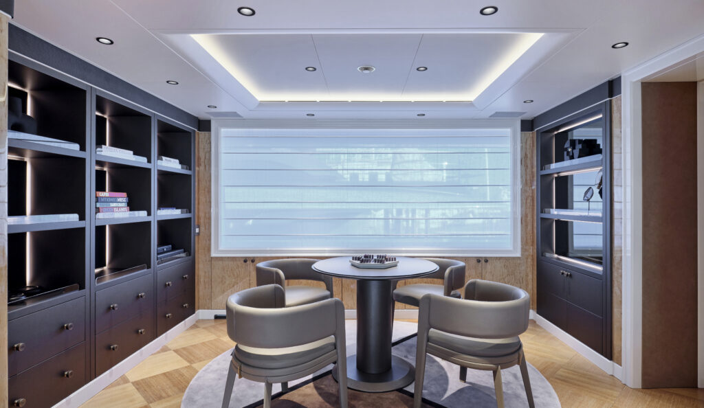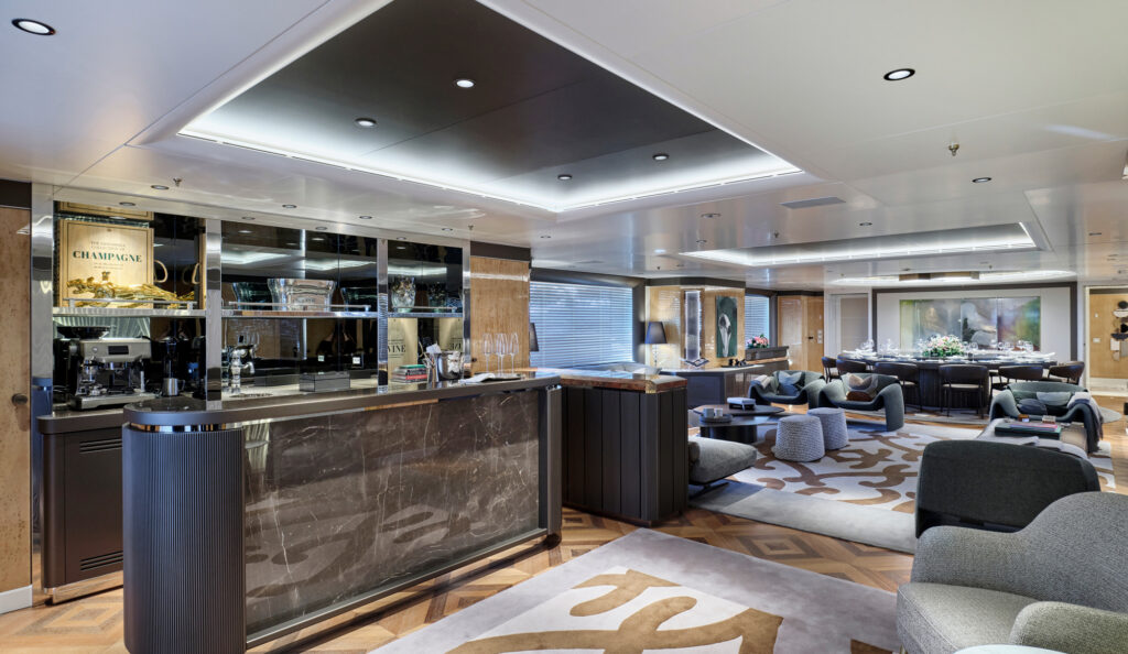 Lighting played a pivotal role in the refit, with a photometric study informing the placement of anti-glare spotlights to correct previous dark areas and improve overall visual comfort. The bridge dining room has also been entirely reimagined to maximise natural light, further enhancing the yacht’s inviting ambiance.