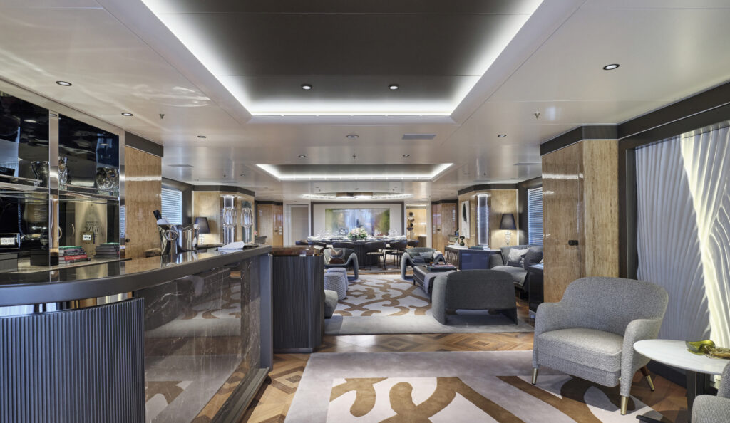 The refit process began with a series of onboard meetings, allowing Studio Vafiadis to understand the owners’ needs while they used the yacht. The brief focused on enhancing comfort, improving lighting, and updating materials, all while maintaining the vessel’s functional layout. Central to the redesign was the redecoration of the expansive main salon, which now features newly designed seating, a striking custom bar, and a grand dining table. The entrance to the salon is one of the most notable transformations, with a bespoke bar adorned in flooded wood bronze decoration and Amani marble, set against a striking “rose petal” feature wall with hidden lighting. Two Giò Ponti armchairs, inspired by the 1950s golden era of ocean liners, add a touch of timeless elegance.