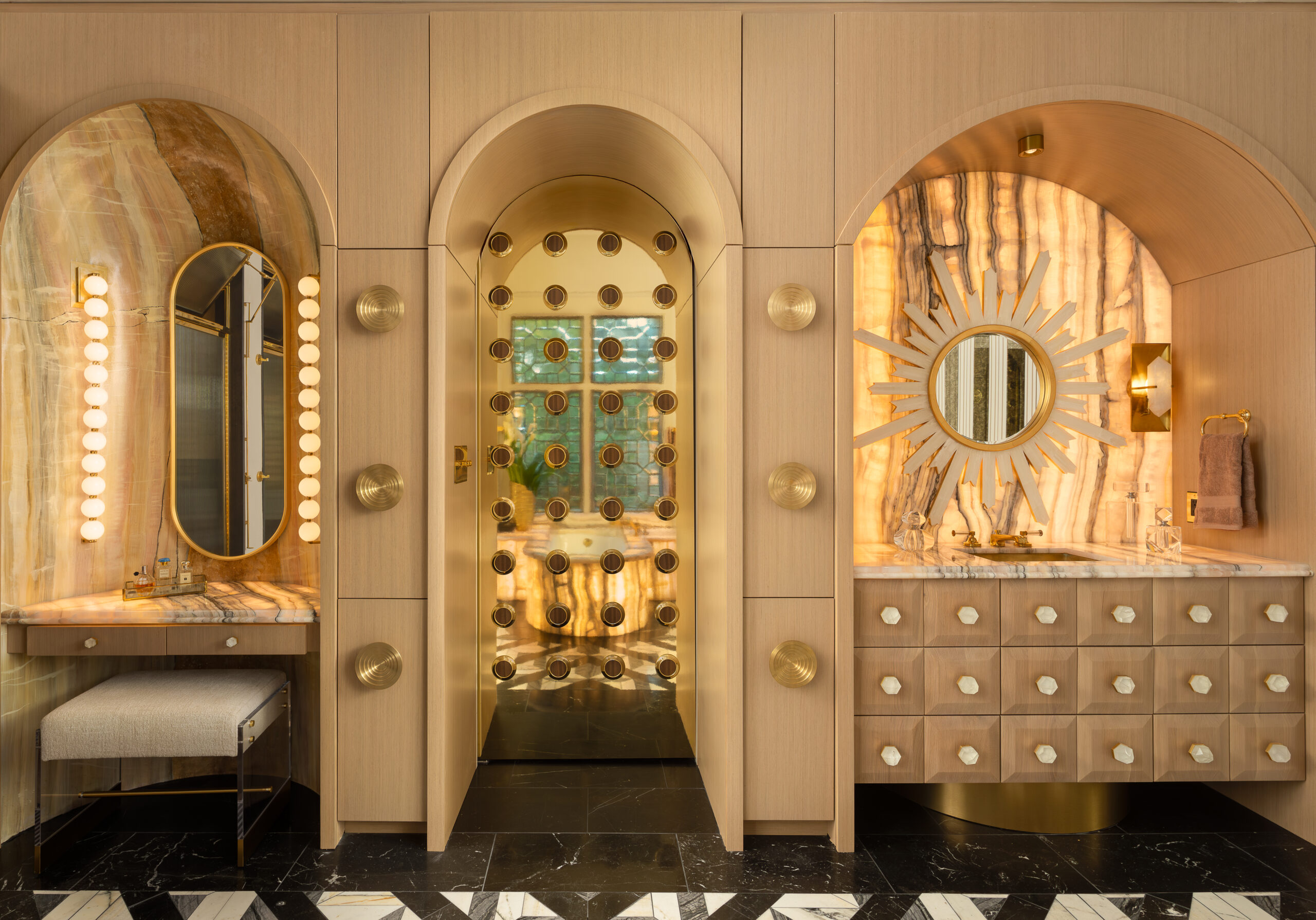 Designed by Younique Designs, this Parisian Art Deco – inspired bathroom transforms a dated 1990s space into a refined sanctuary defined by light, geometry, and ritualistic luxury. Drawing from the French architectural character of the residence and the homeowners’ appreciation for bold, expressive interiors, the design merges elegance with indulgence while resolving functional shortcomings such as limited storage and poor spatial cohesion.